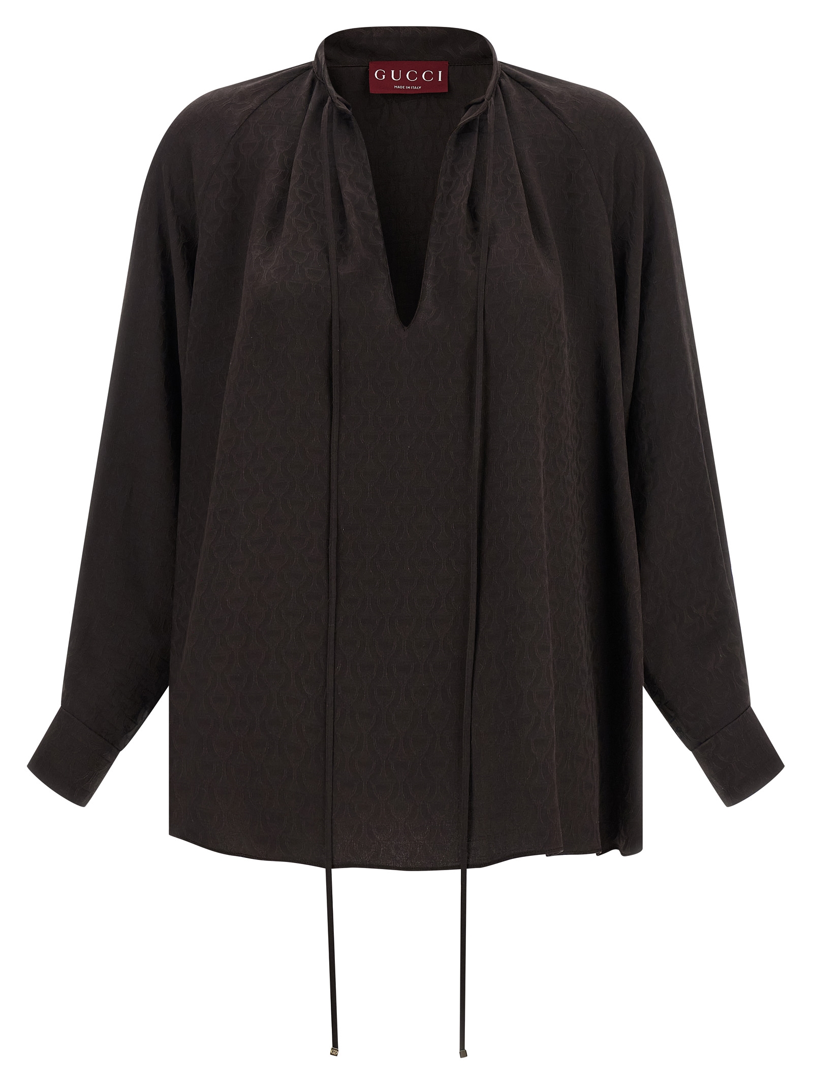 ‘Morsetto’ jacquard patterned silk shirt, flared silhouette, front V-neck with drawstring to tie as desired, long raglan sleeves with cuffs.