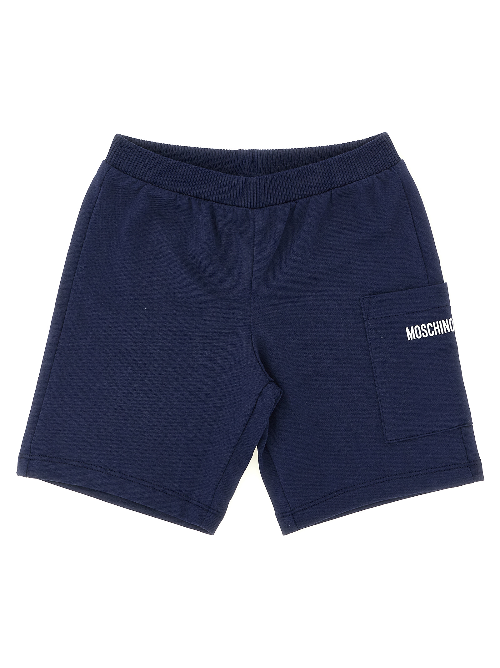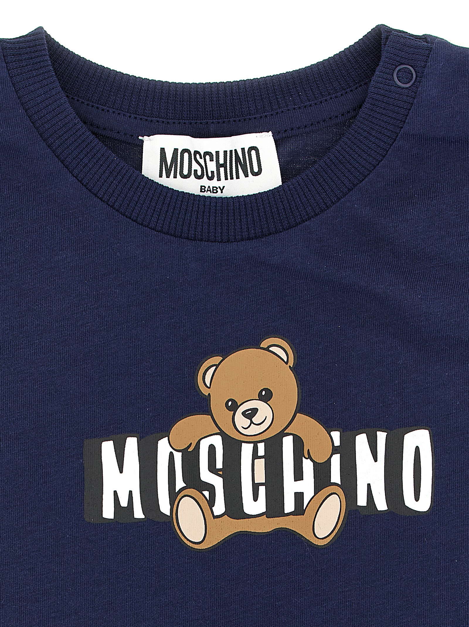Cotton jersey suit consisting of crewneck t-shirt, front ‘Moschino Teddy Bear’ print, snap buttons on the left shoulder, short sleeves, Bermuda shorts with elastic waistband and cargo pocket with lettering logo print.