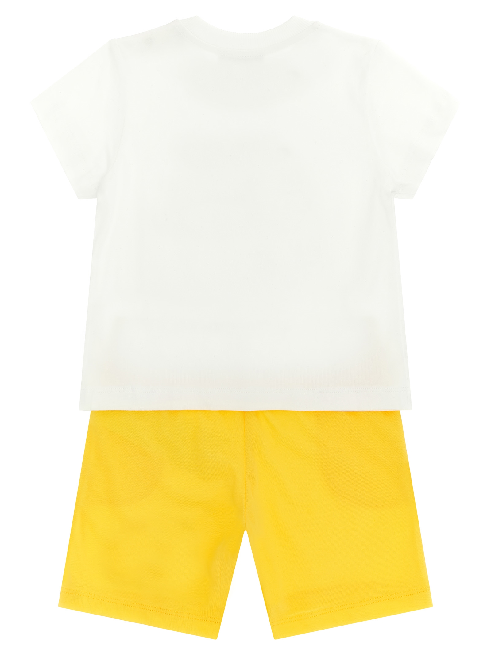 Cotton jersey suit with front ‘Moschino Teddy Bear’ print consisting of crewneck t-shirt, snap buttons on the left shoulder, short sleeves and Bermuda shorts with elastic waistband and pockets.