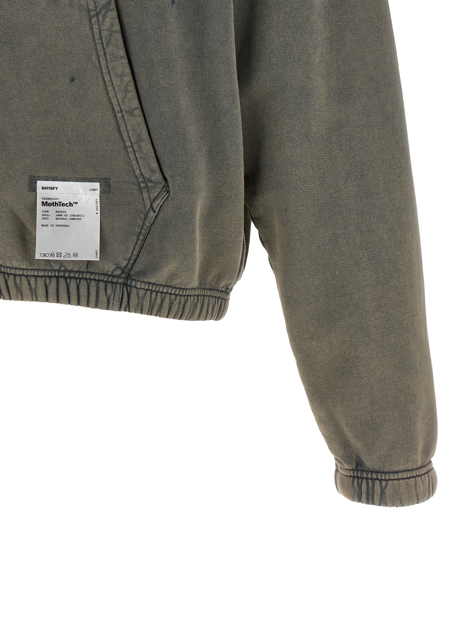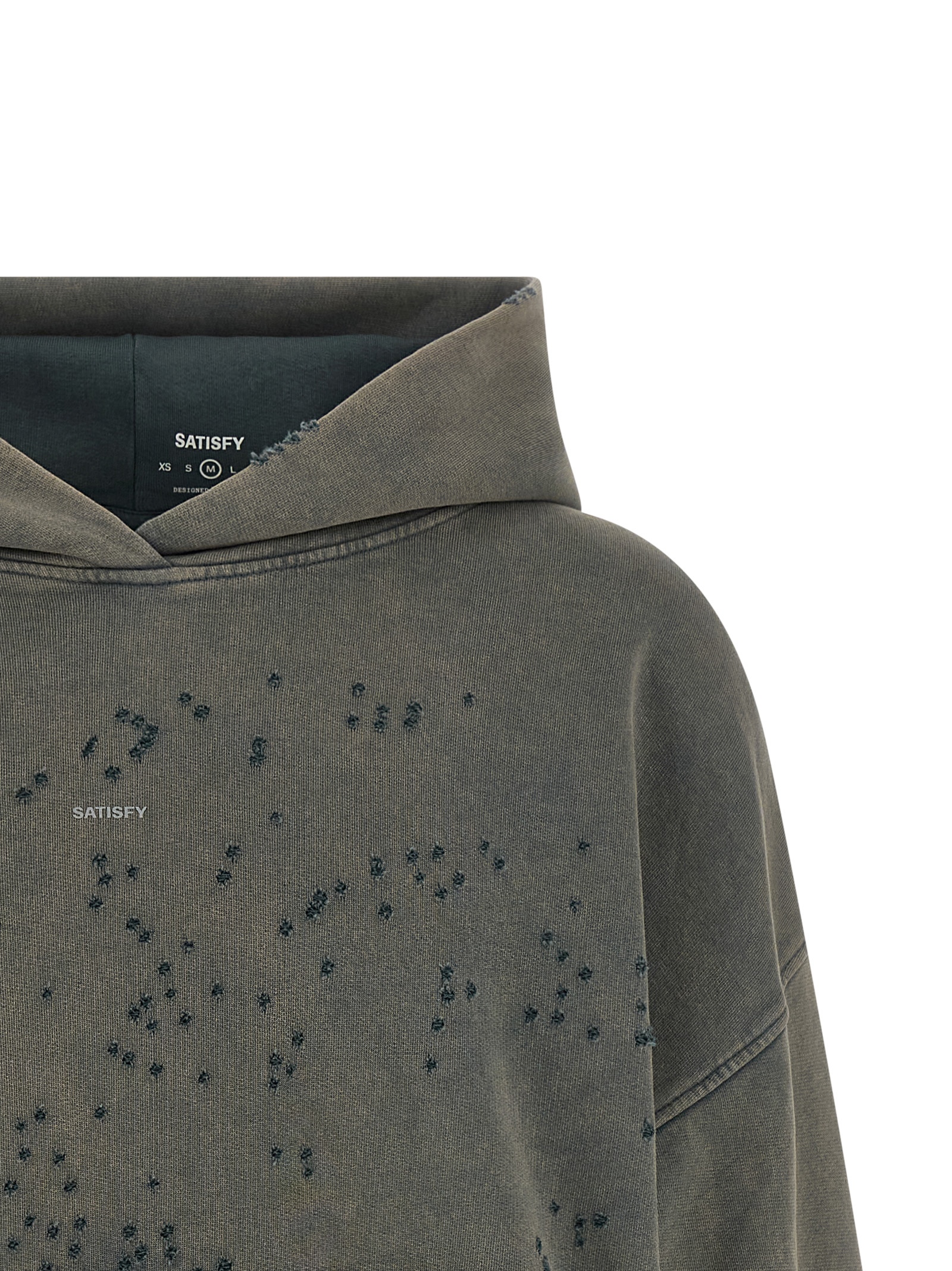 ‘MothTech™’ hoodie in softened, aged and breathable 175 gr combed cotton, laser-cut holes opened by hand, front logo print, kangaroo pocket, long sleeves with elastic cuffs and dropped shoulder, elastic hem, ‘©SATISFY logo print’ rear reflective, label with washing instructions completely detachable on the outside.