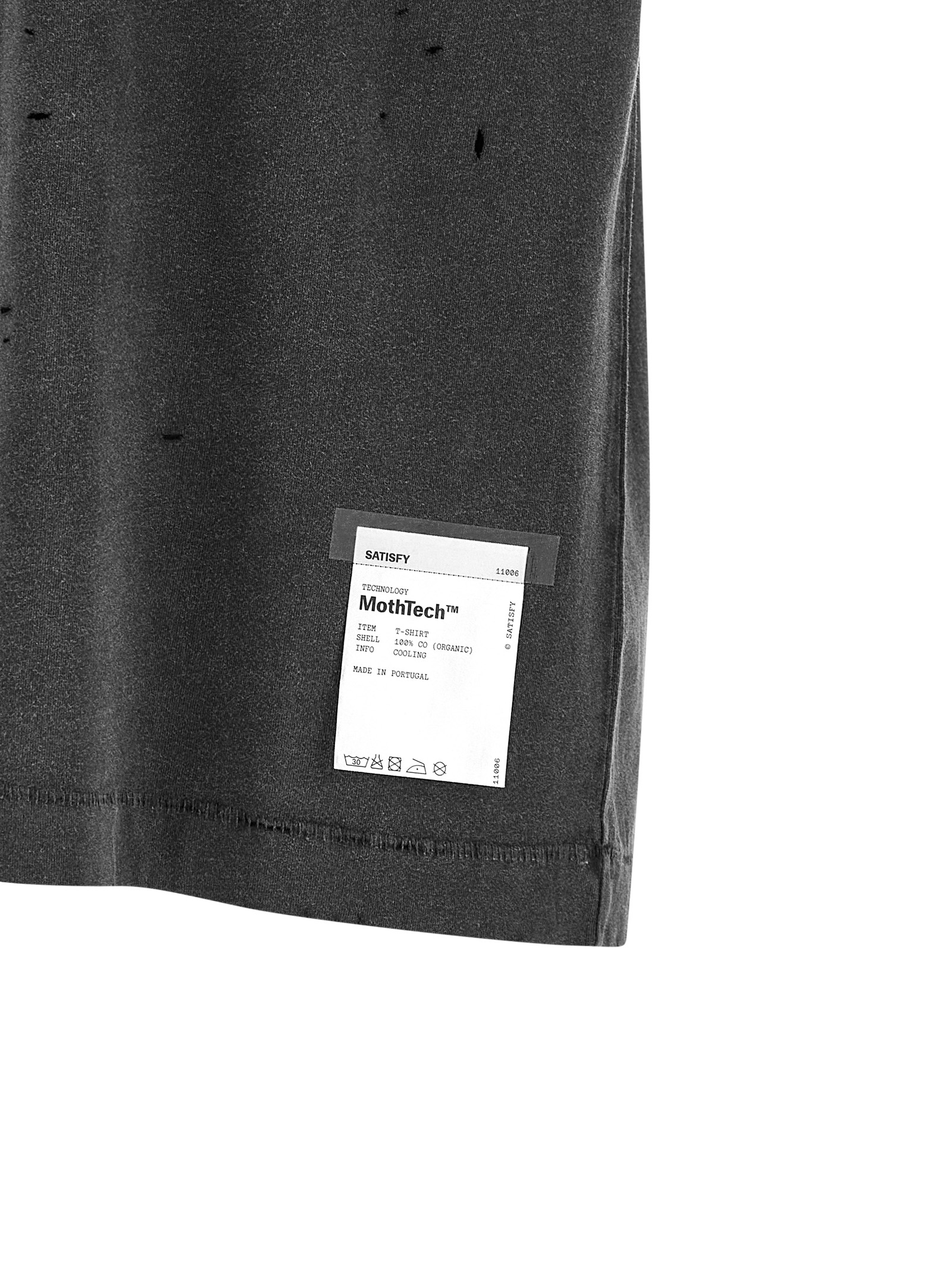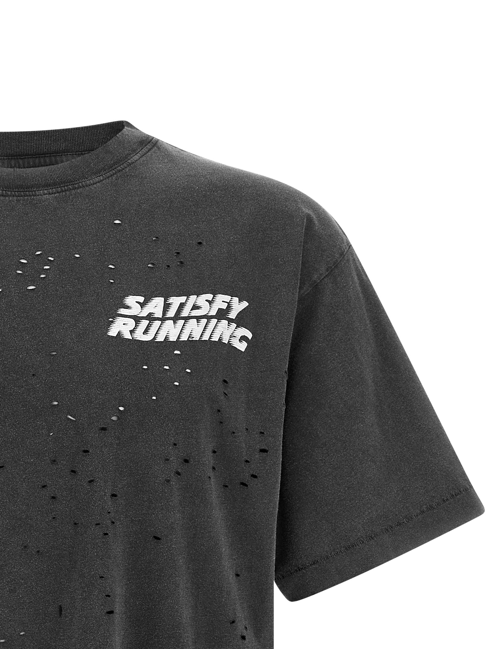 Softened, aged and breathable 175 gr combed cotton ‘MothTech™’ t-shirt, laser-cut holes opened by hand, ‘SATISFY Running’ print with inflated ink on the front, crew neck, short sleeves with dropped shoulder, label with washing instructions completely detachable on the outside.