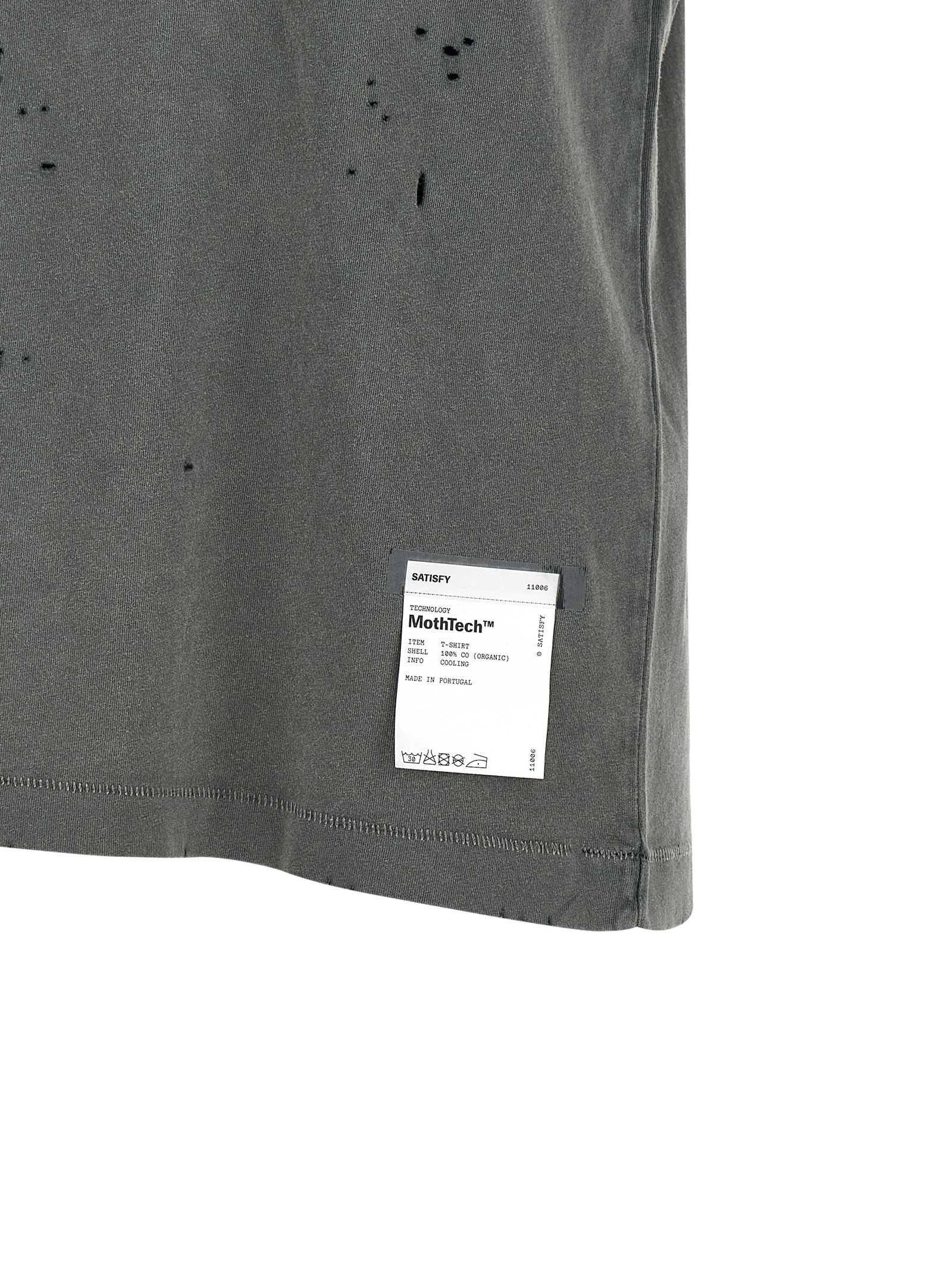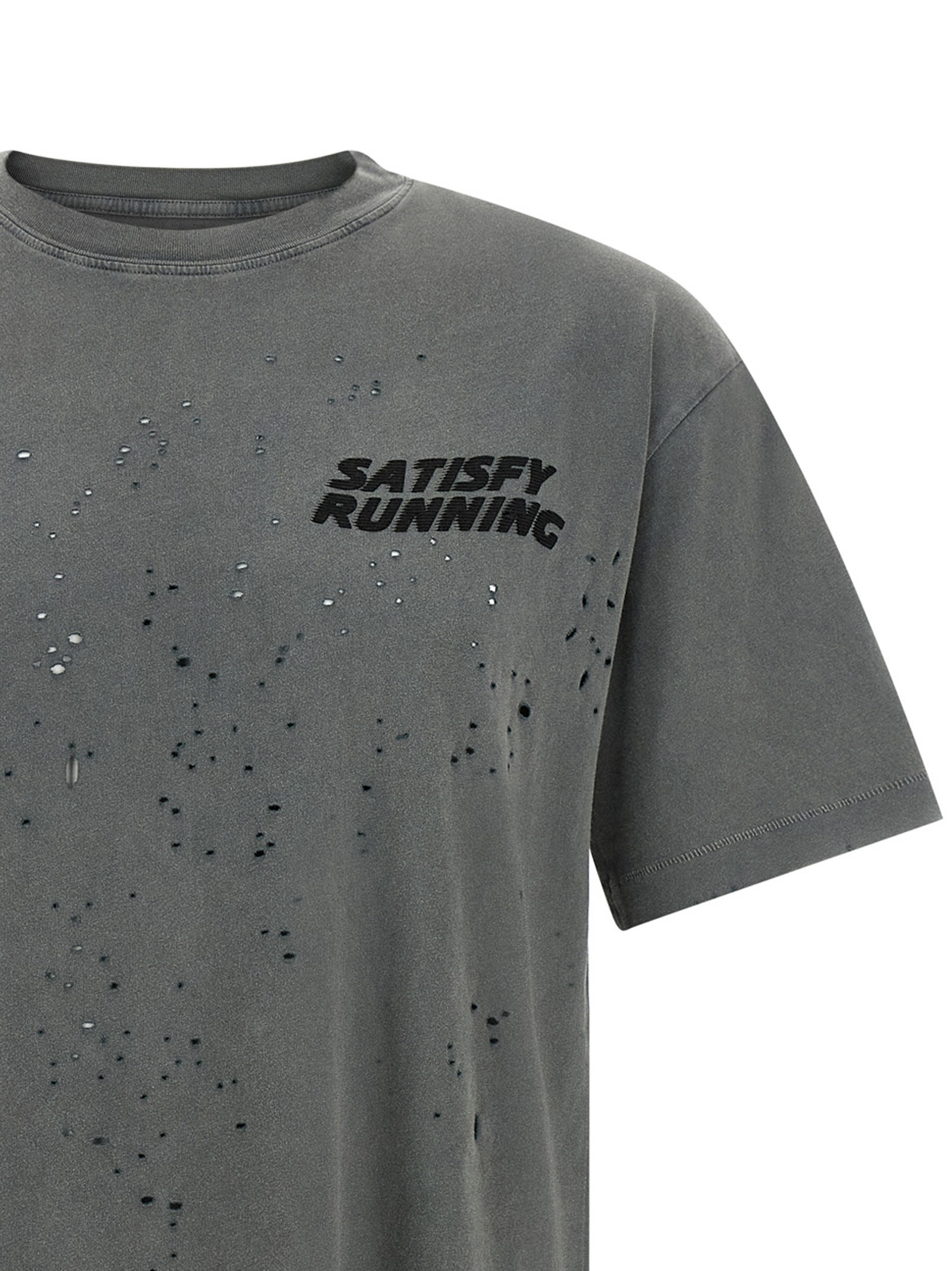 Softened, aged and breathable 175 gr combed cotton ‘MothTech™’ t-shirt, laser-cut holes opened by hand, ‘SATISFY Running’ print with inflated ink on the front, crew neck, short sleeves with dropped shoulder, label with washing instructions completely detachable on the outside.