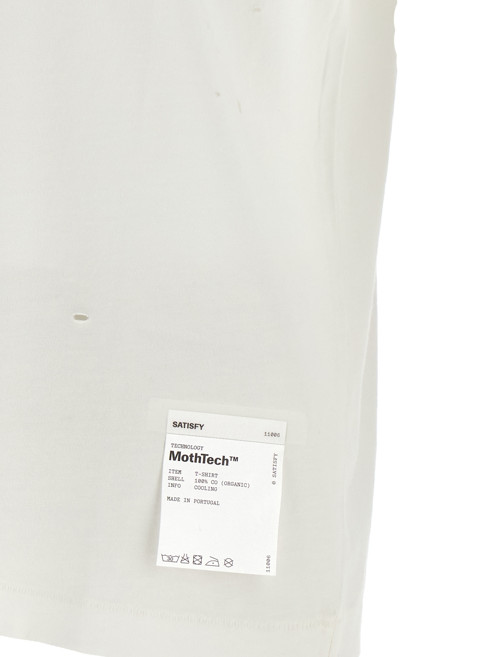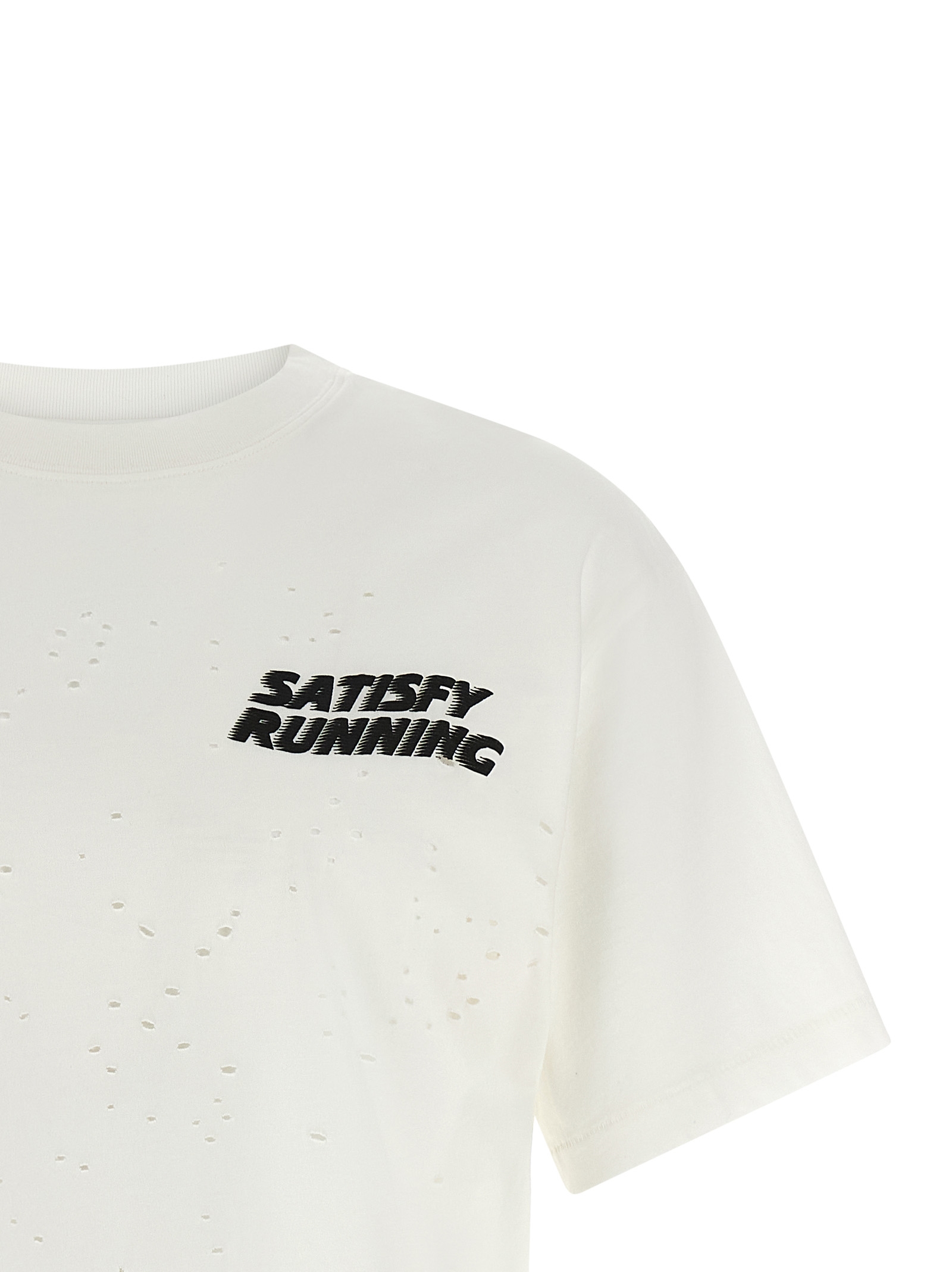 Softened and breathable 175 gr combed cotton MothTech™ T-shirt, laser-cut holes opened by hand, ‘SATISFY Running’ print with swollen ink on the front, crew neck, short sleeves with dropped shoulder, label with washing instructions completely detachable on the outside.
