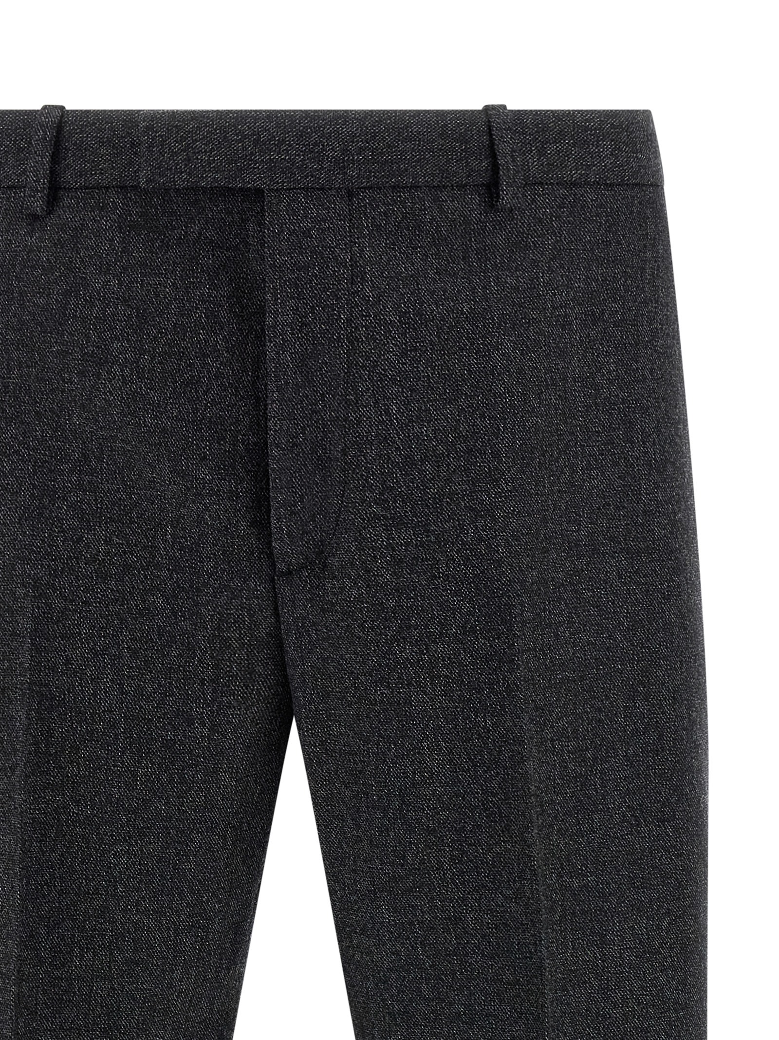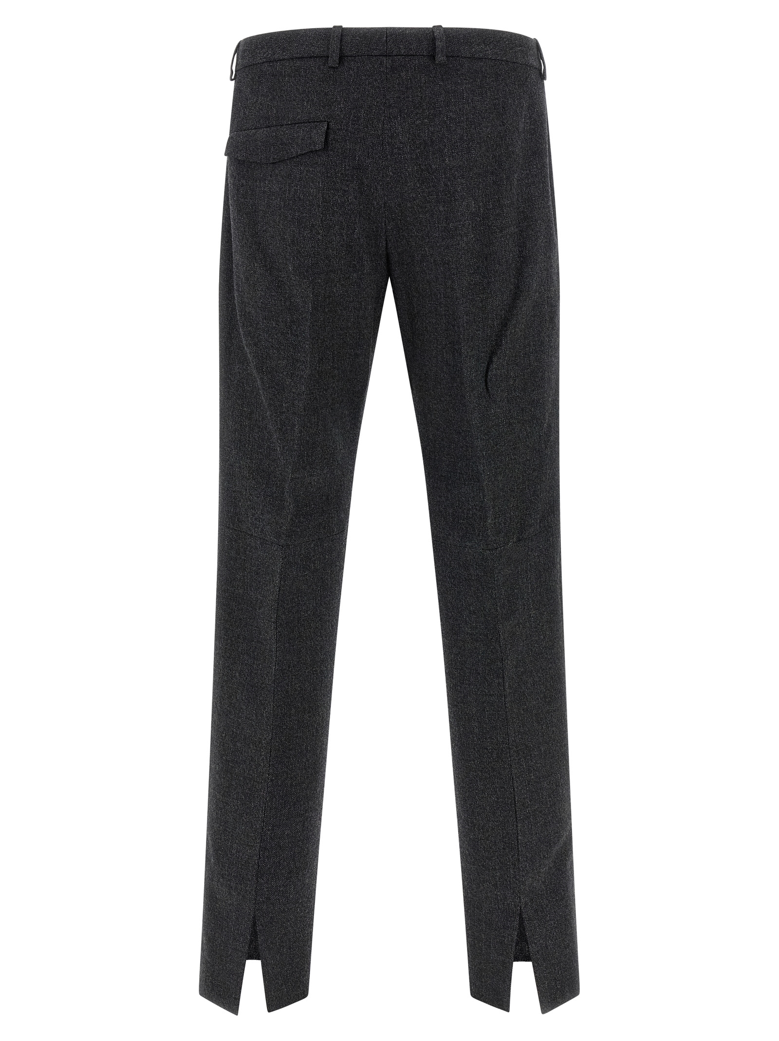 Trousers in wool mouliné fabric, tailored cut, stretched pleat, hook and front button zip closure, pockets, straight leg, back slit on the leg bottom.