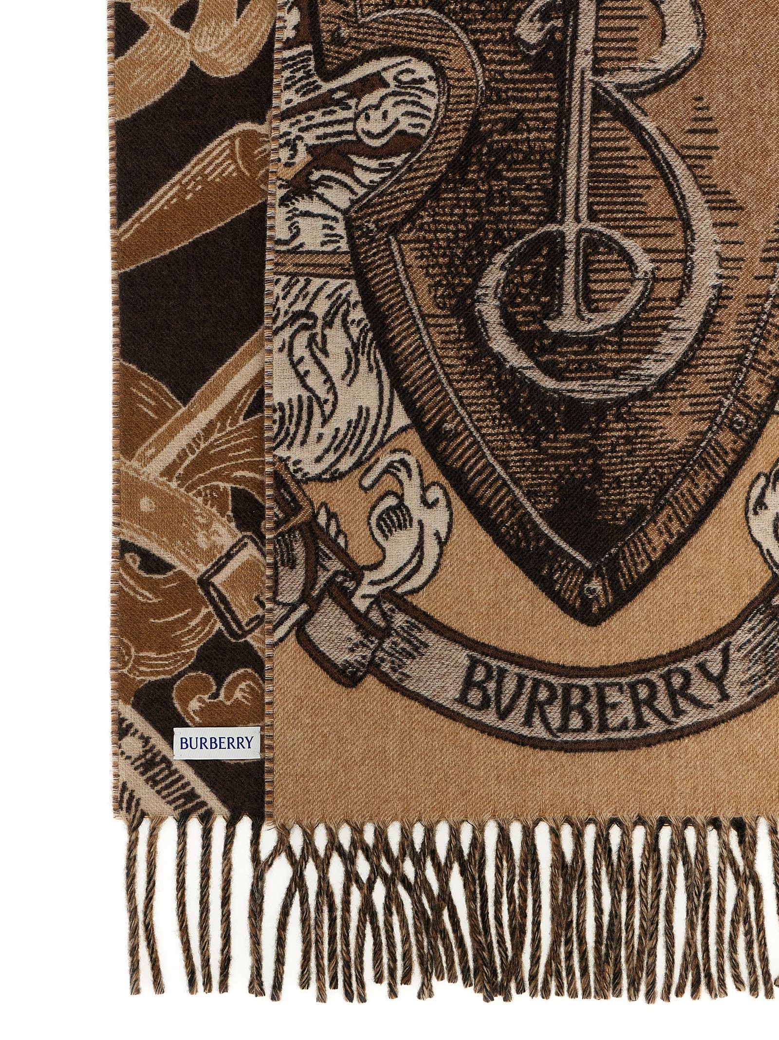 ‘Mu Etched Knight’ cashmere scarf with jacquard ‘Equestrian Knight Design’ and fringed edges.