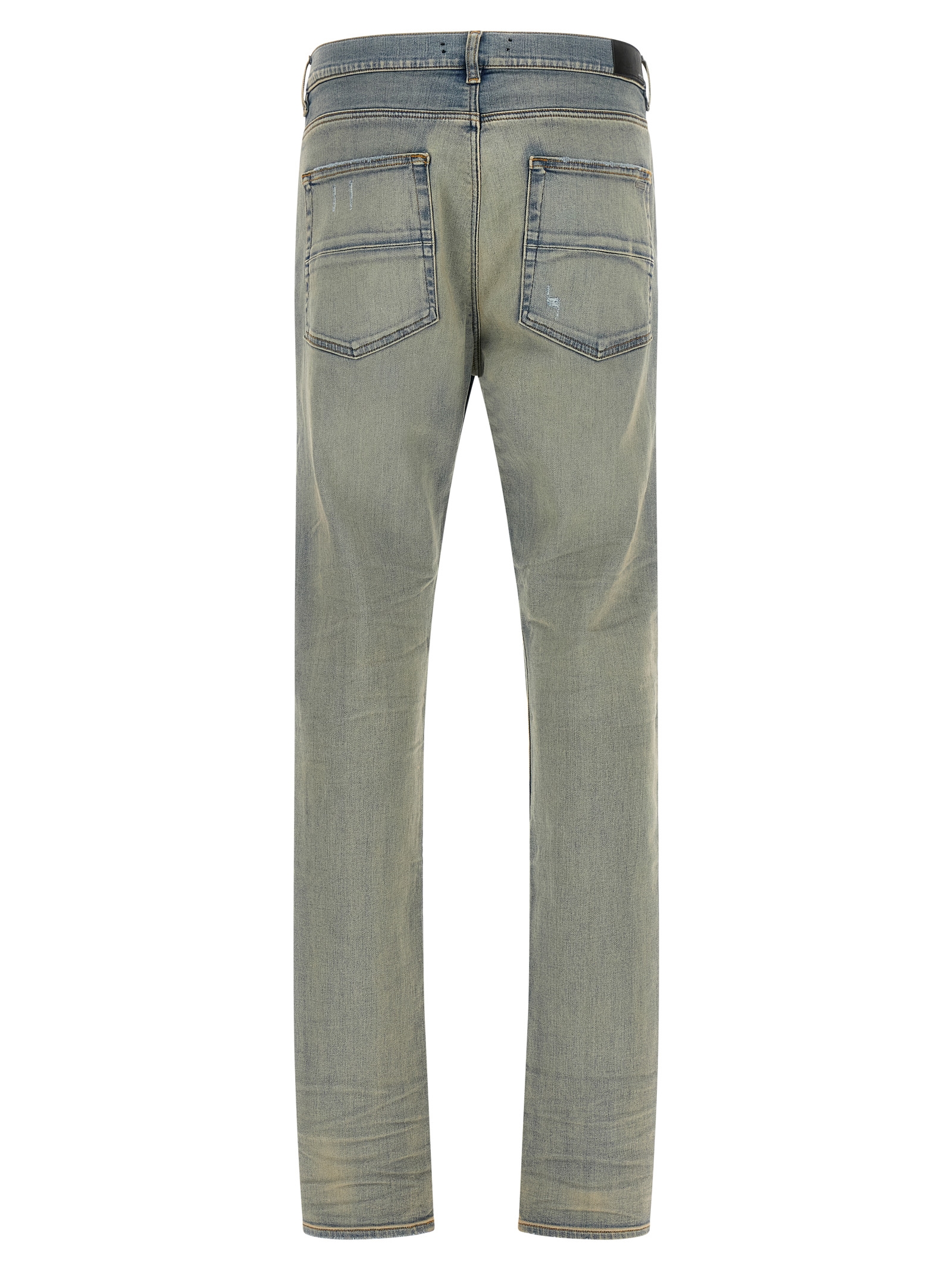 ‘Suede MX1’ used-effect stonewashed stretch cotton denim jeans with exposed ribbed suede repair, front button closure, five pockets, and back leather logo tag.