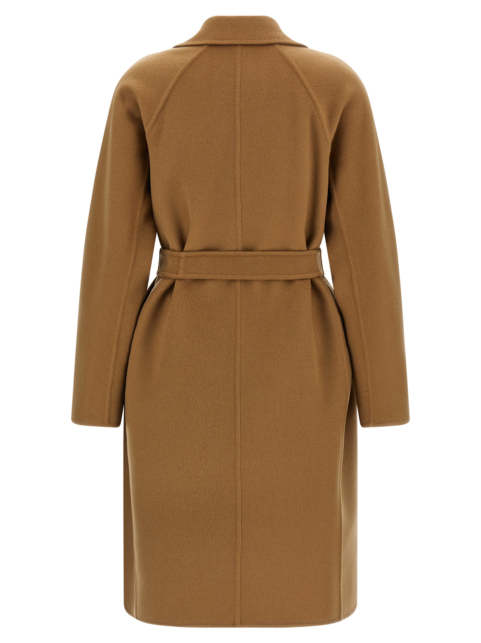 ‘Mxmaceri’ midi coat in double drap of hand-stitched pure cashmere finished with tailored dot, dressing gown style, lapel collar, raglan-cut kimono sleeves on the back, pockets, unlined, removable belt.