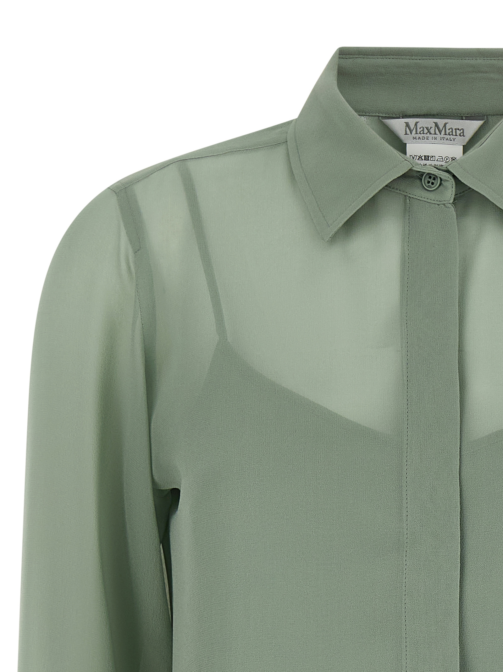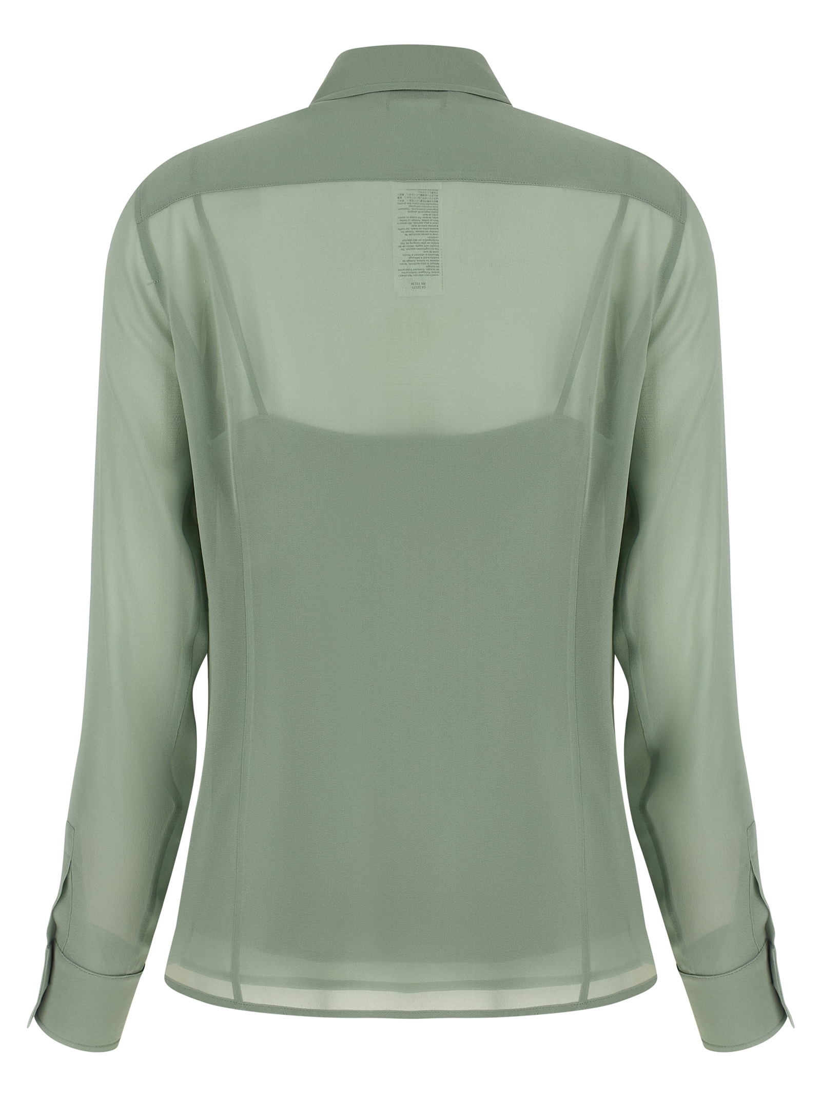 ‘MxmGolfo’ semi-transparent pure silk crêpe de Chine shirt with front button closure, long cuffed sleeves, side slits, rounded hem, removable thin strap top.