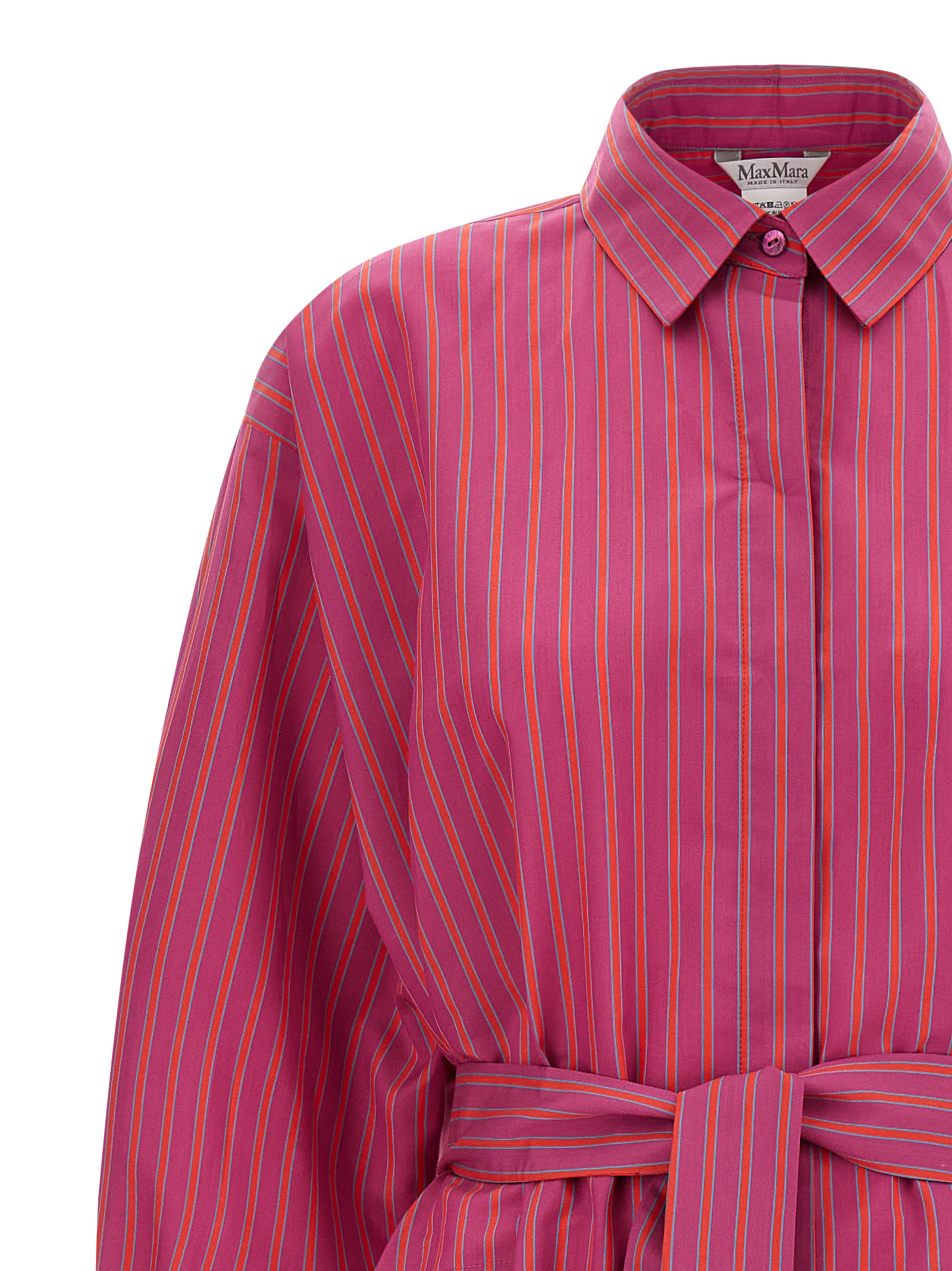 Long ‘MxmLord’ striped cotton poplin dress, chemisier model, concealed front button closure, long wide sleeves with cuffs and dropped shoulder, pockets, back rack with cannon pleats, removable matching belt.