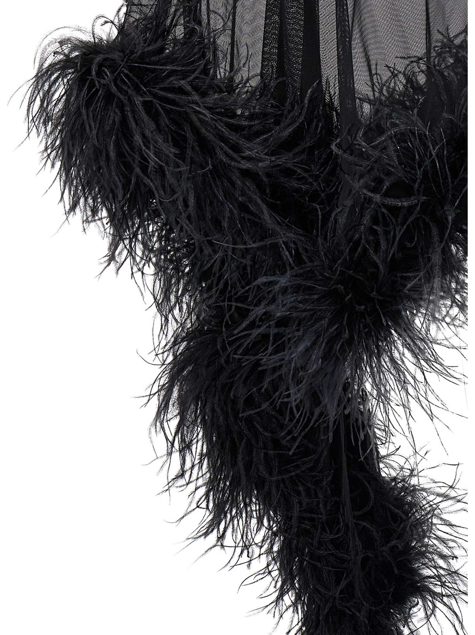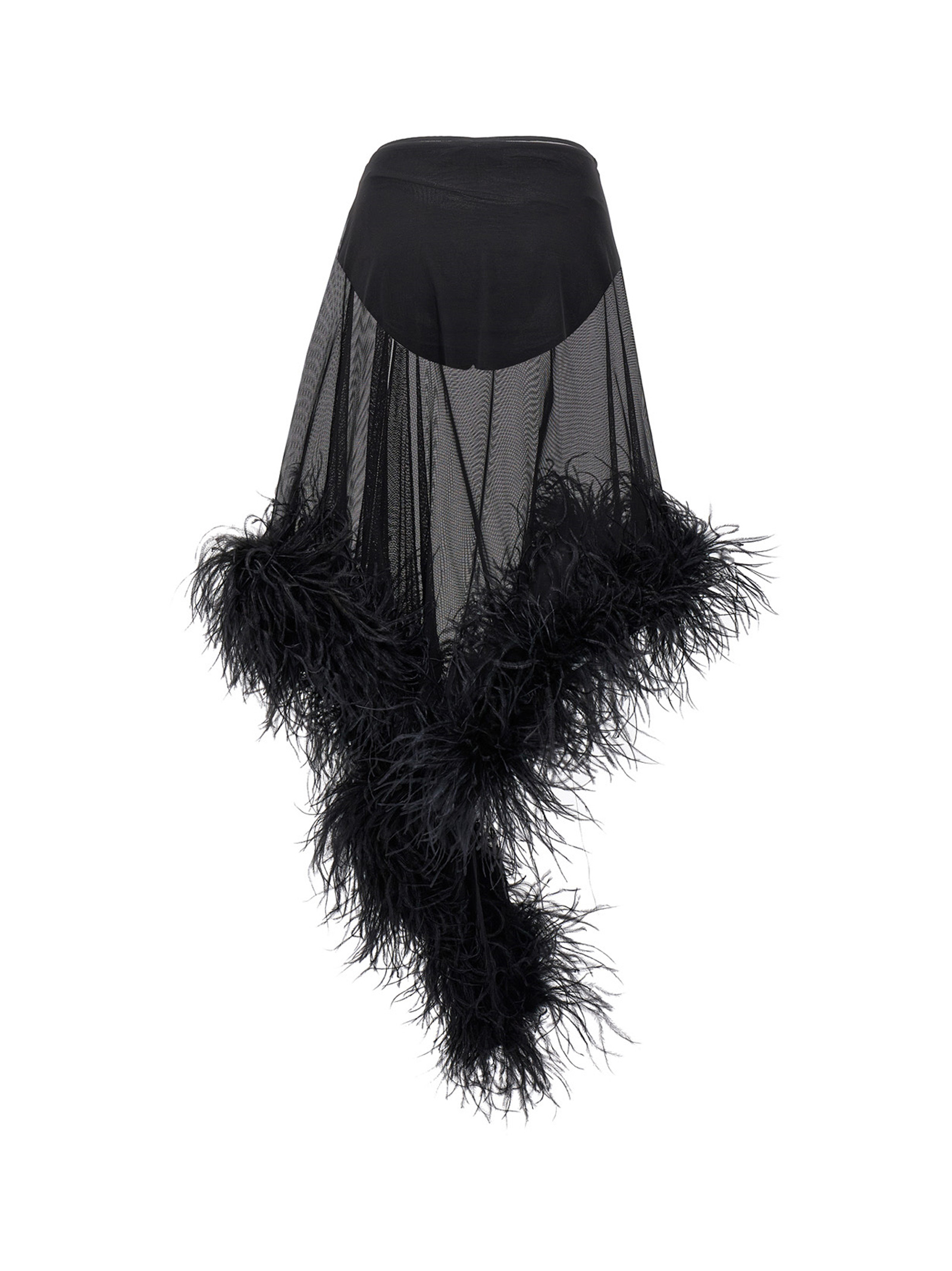 Mya’ asymmetric elastic jersey skirt with feather buoy on the bottom hem and a side split.