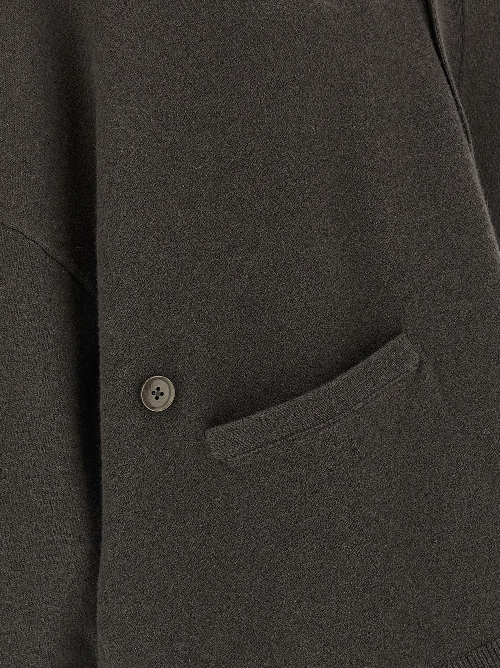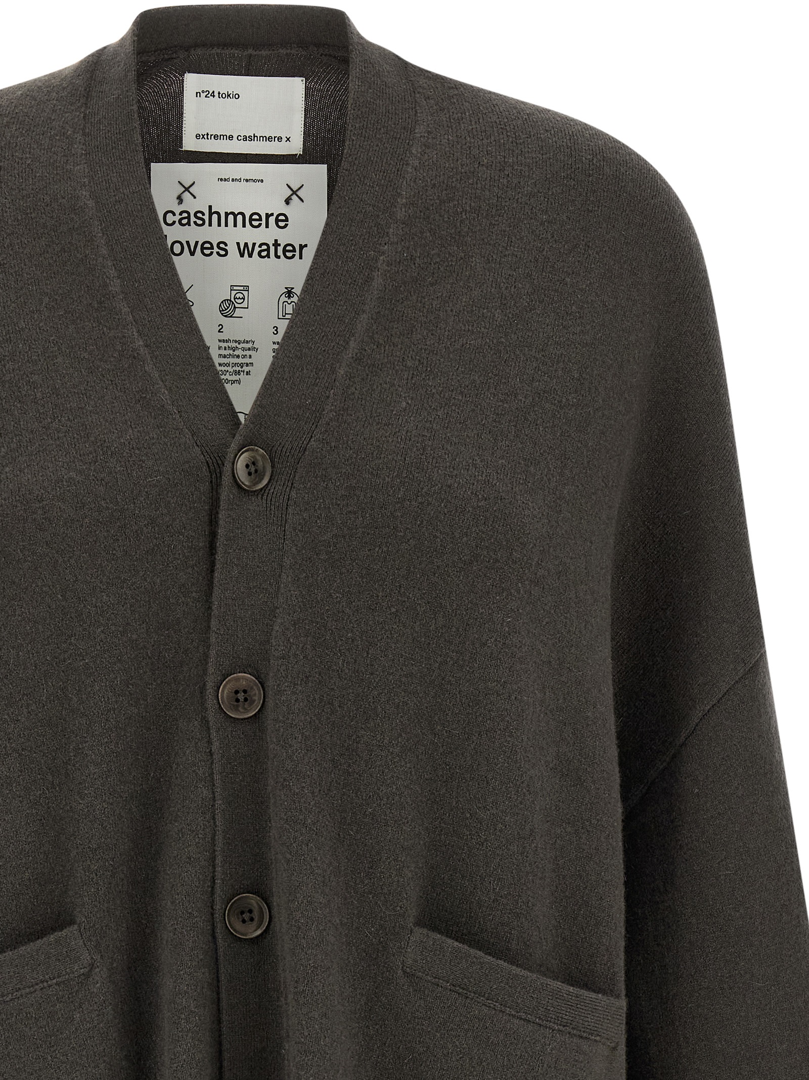 ‘N°24 Tokio’ cashmere blend cardigan, V-neck, front corozo button closure plus a side one that can change the fit, side slits, pockets, long sleeves with cuffs and dropped shoulder.