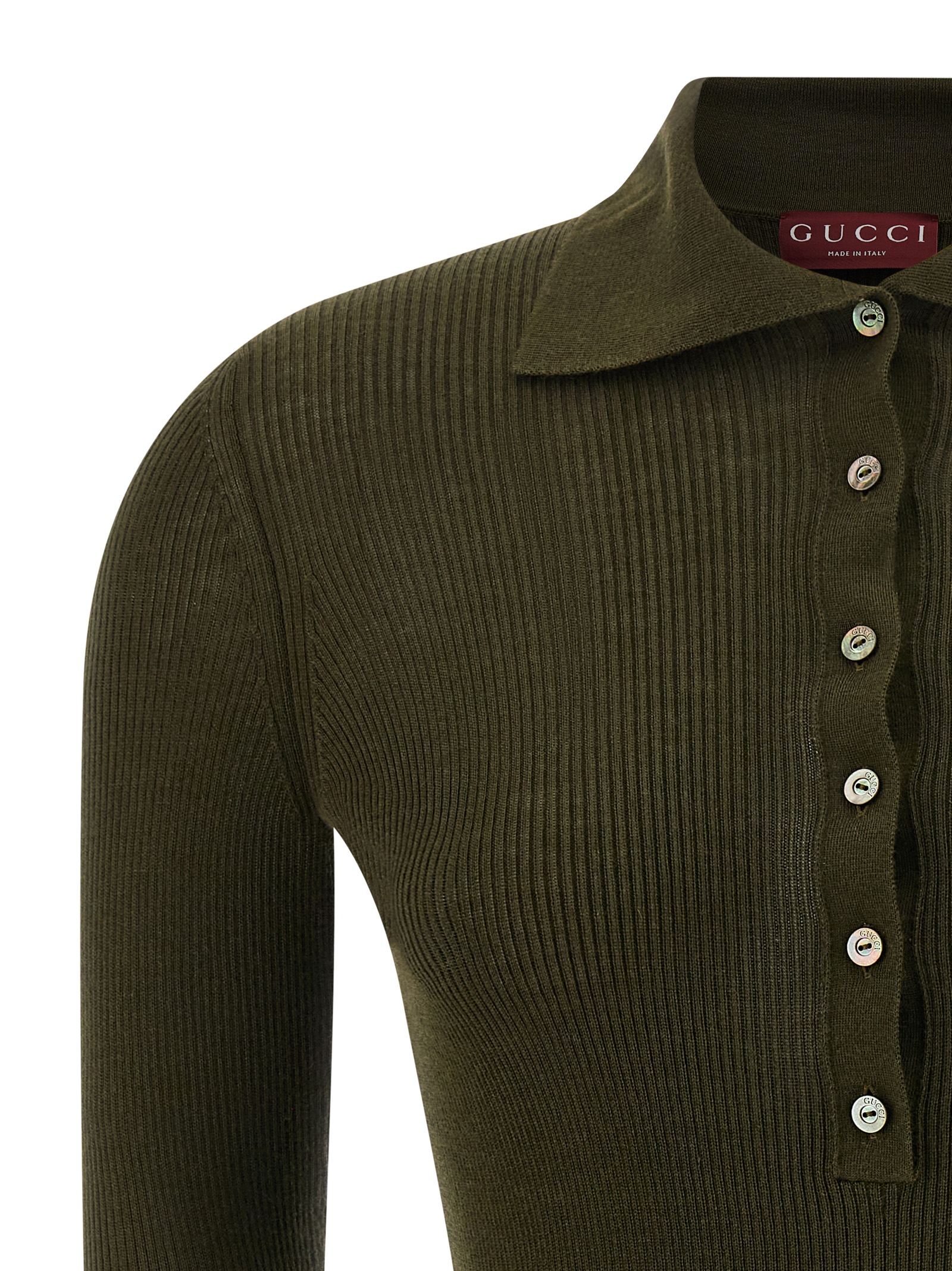 Polo shirt in extra fine ribbed silk and cashmere with ‘Nastro Web’ piping, collar and buttons, and long sleeves.