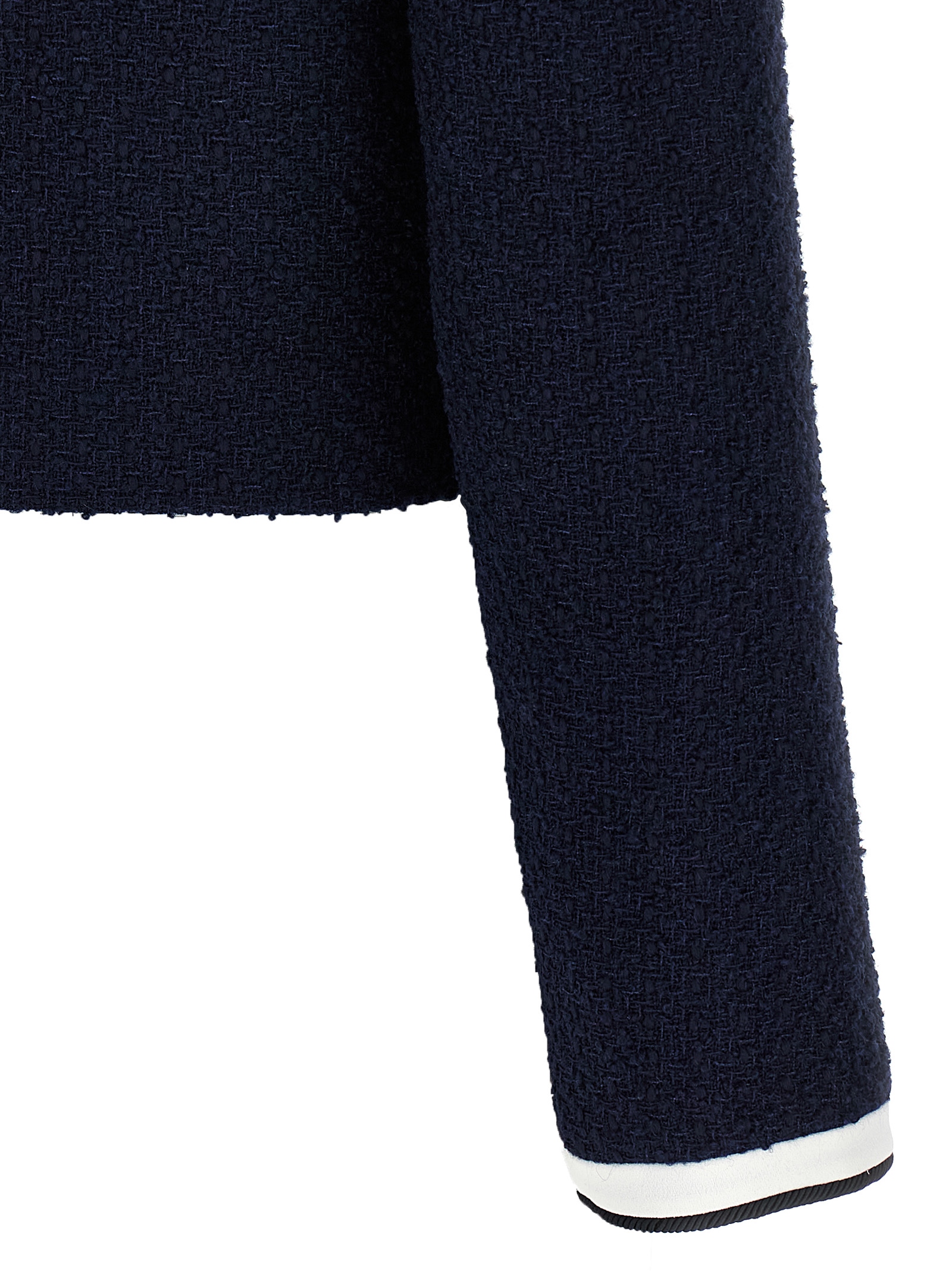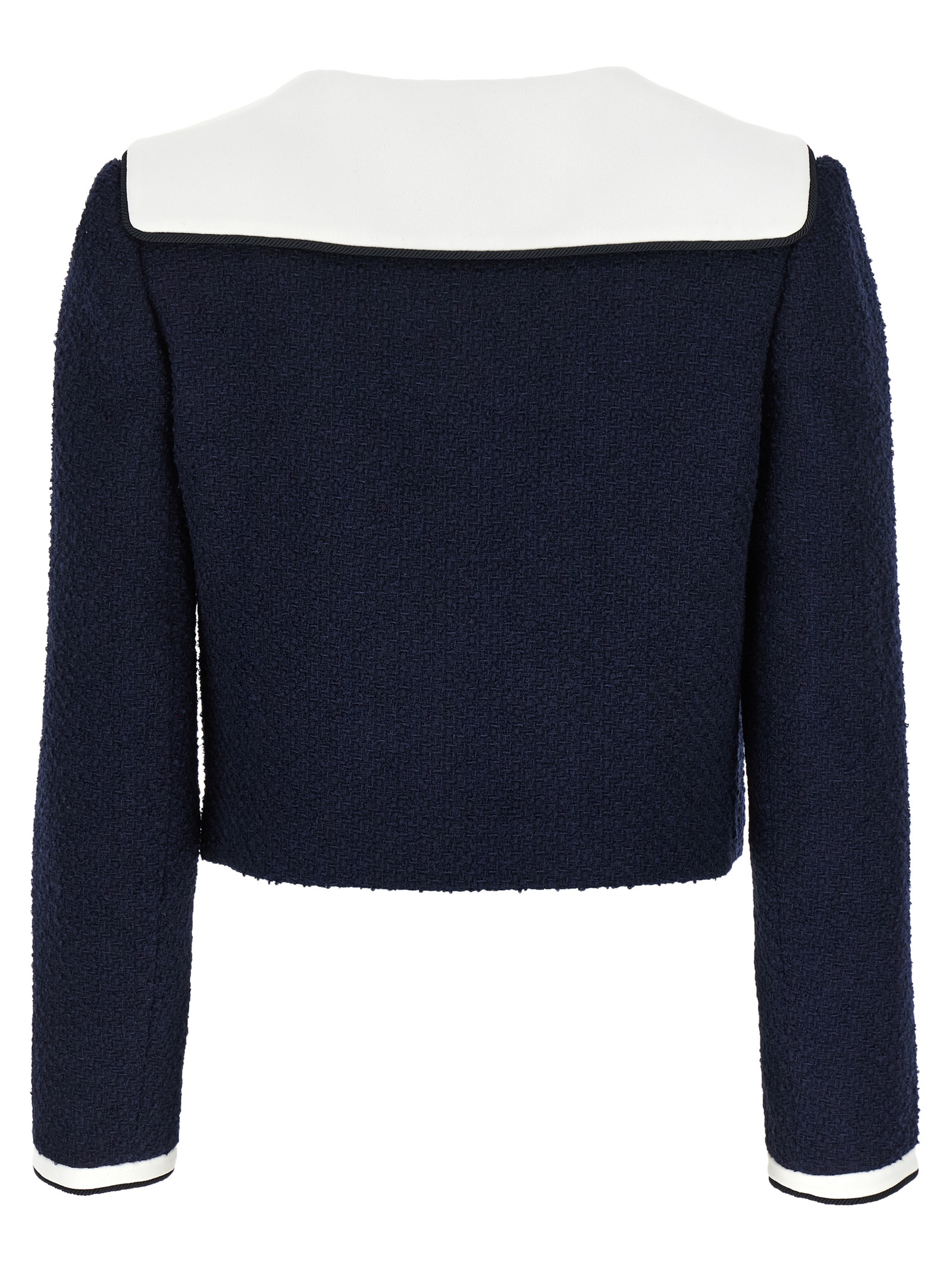 ‘Navy Boucle Contrast Collar’ cropped bouclé blazer with contrast oversized sailor collar, V-neck, front button closure, pockets, long cuffed sleeves, structured shoulder strap, lining.