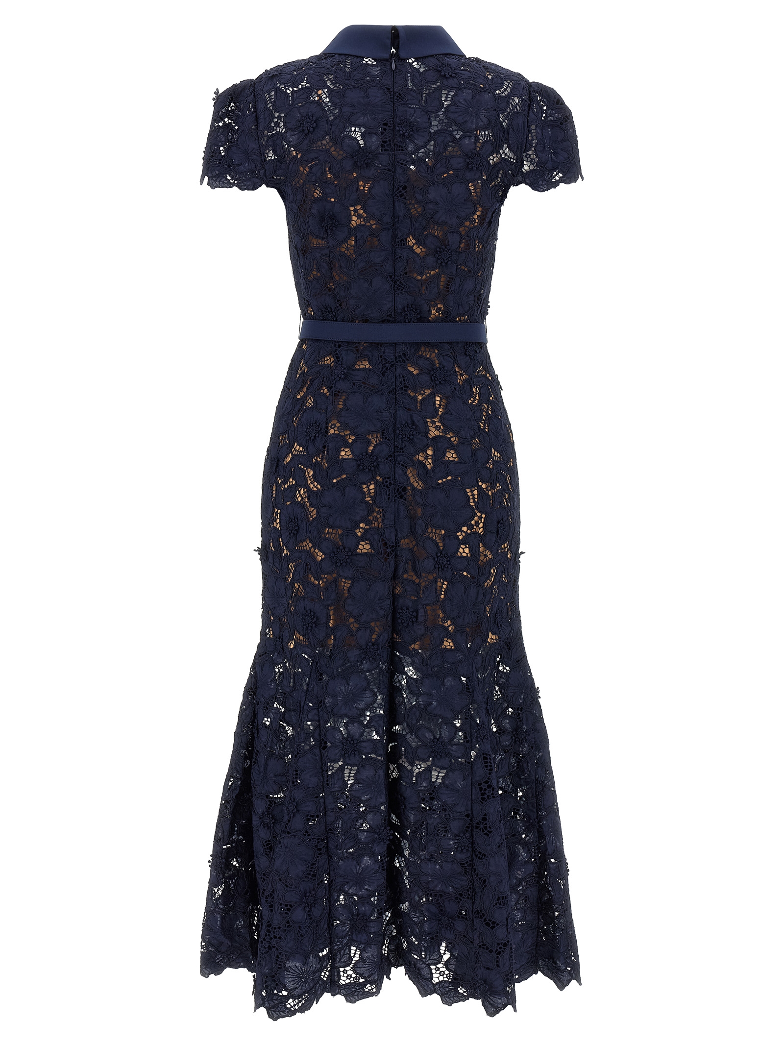 Guipure semi-transparent lace Navy Guipure Lace Midi dress with 3D floral appliqué, tone-on-tone satin shirt collar, back zip closure, short sleeves, flared skirt with asymmetric hem, removable petticoat, and removable matching belt.