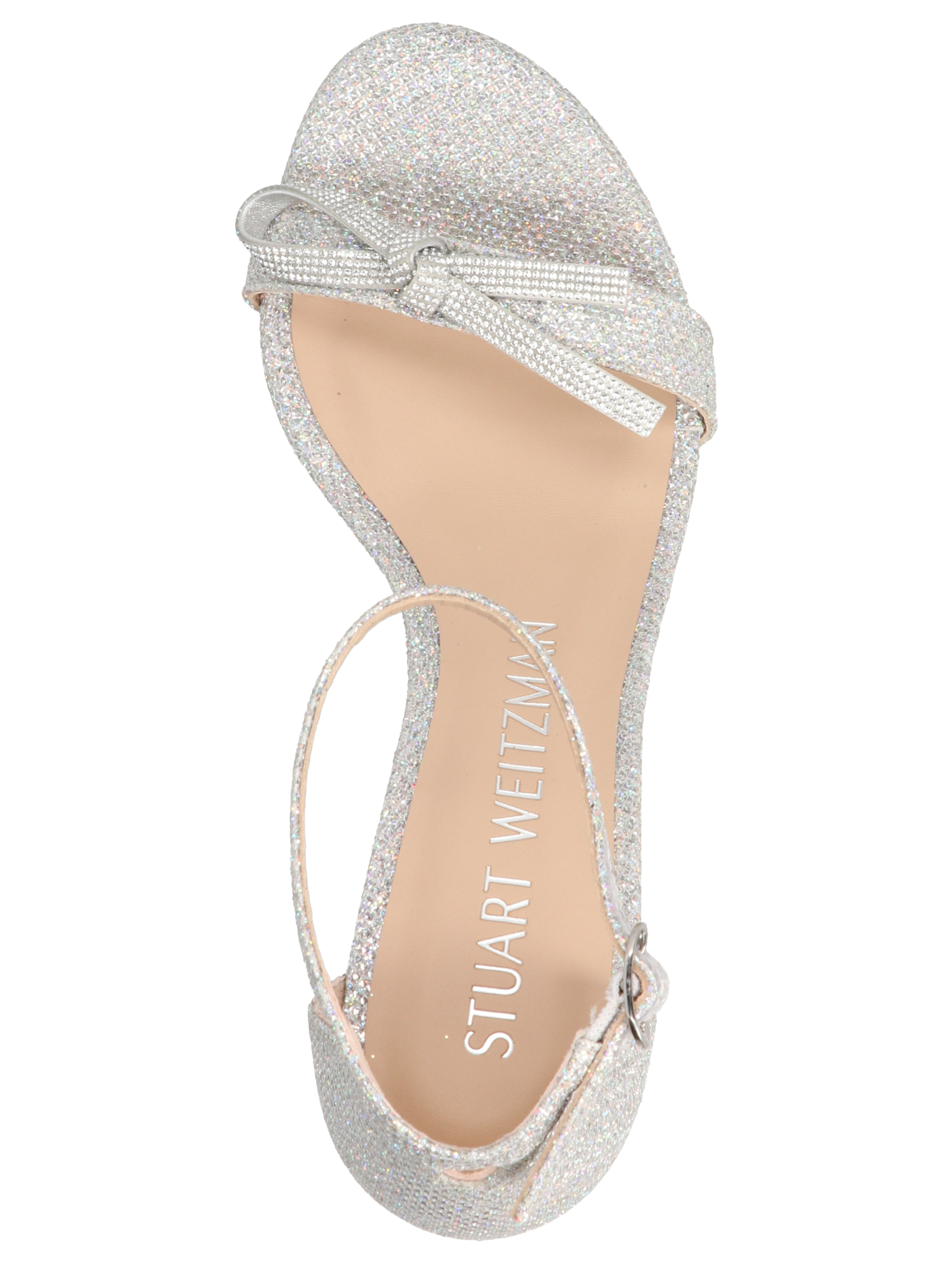 Nearlynude’ silver fabric sandals with bow application at the front and an ankle strap.