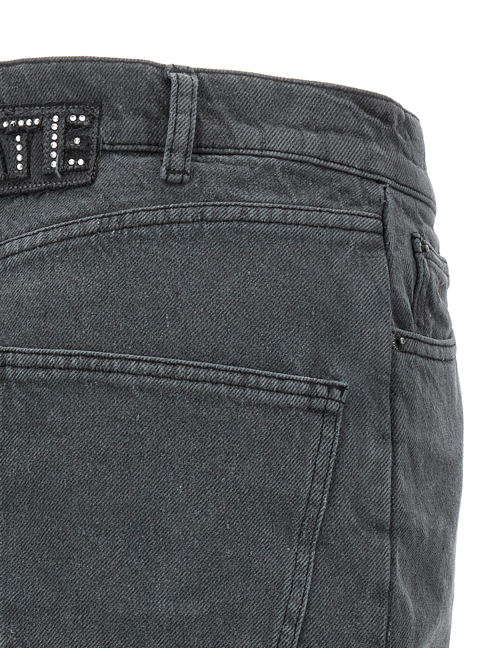 Nela’ cotton denim skirt with sequin logo at the back, a zip and button closure, five pockets.