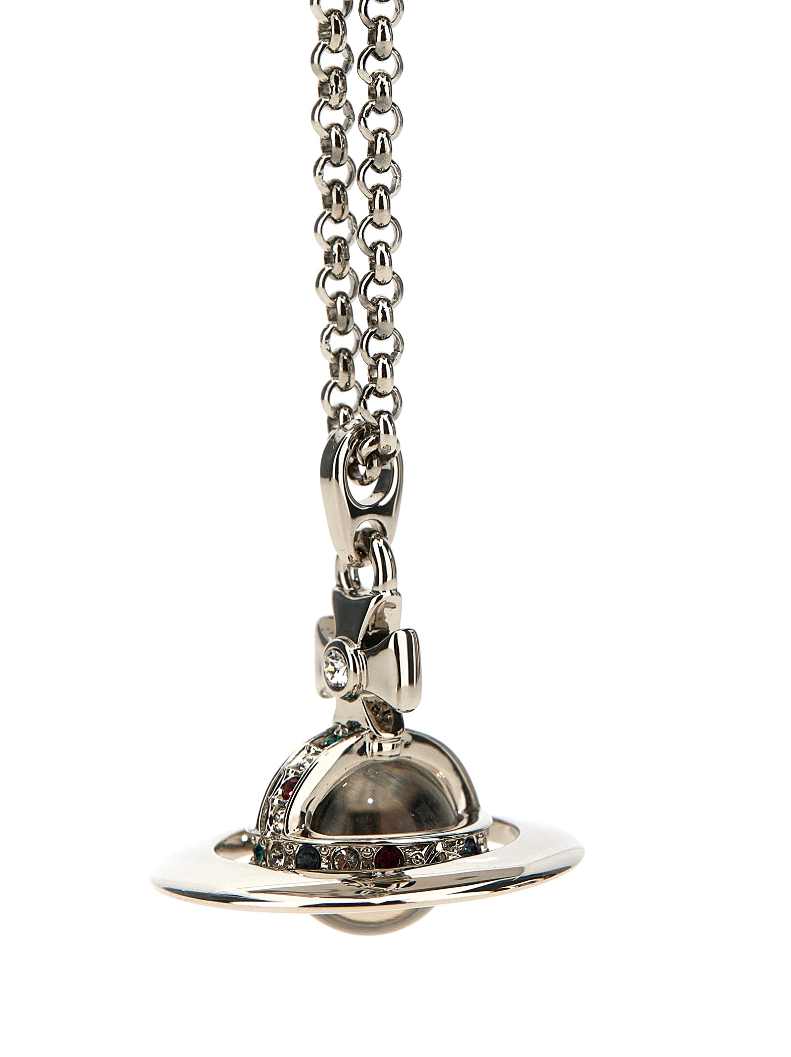 ‘New Tiny Orb Pendant’ necklace in silver metal with logo pendant and crystal application.