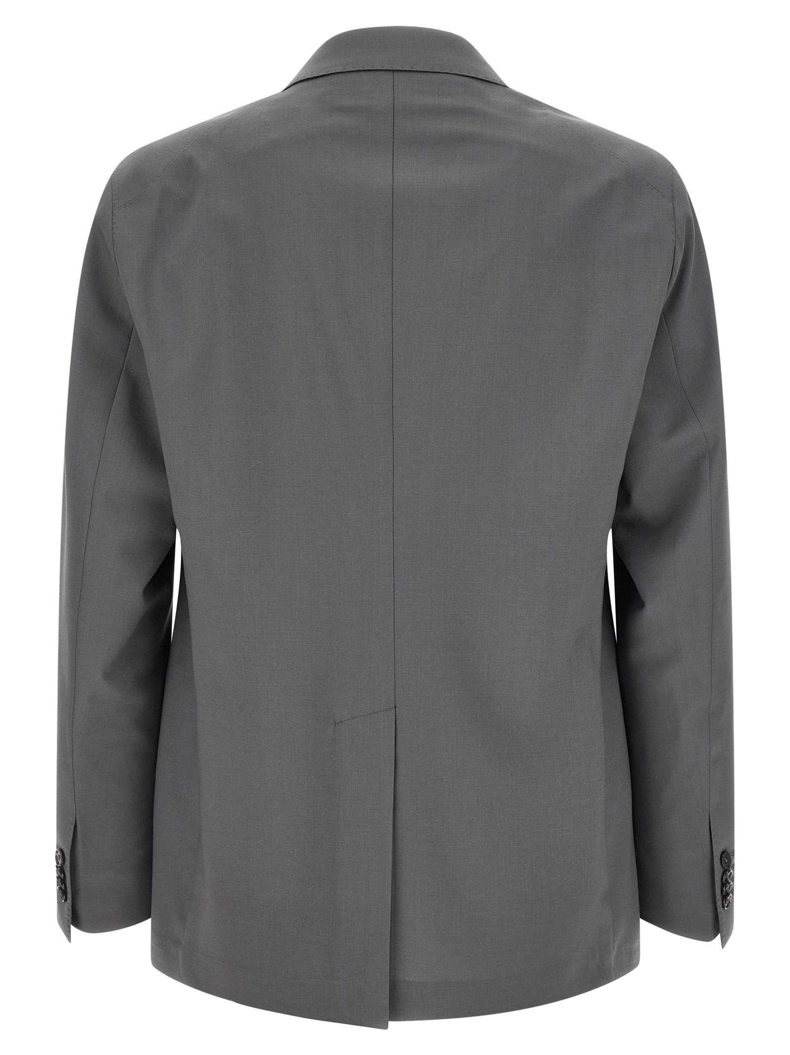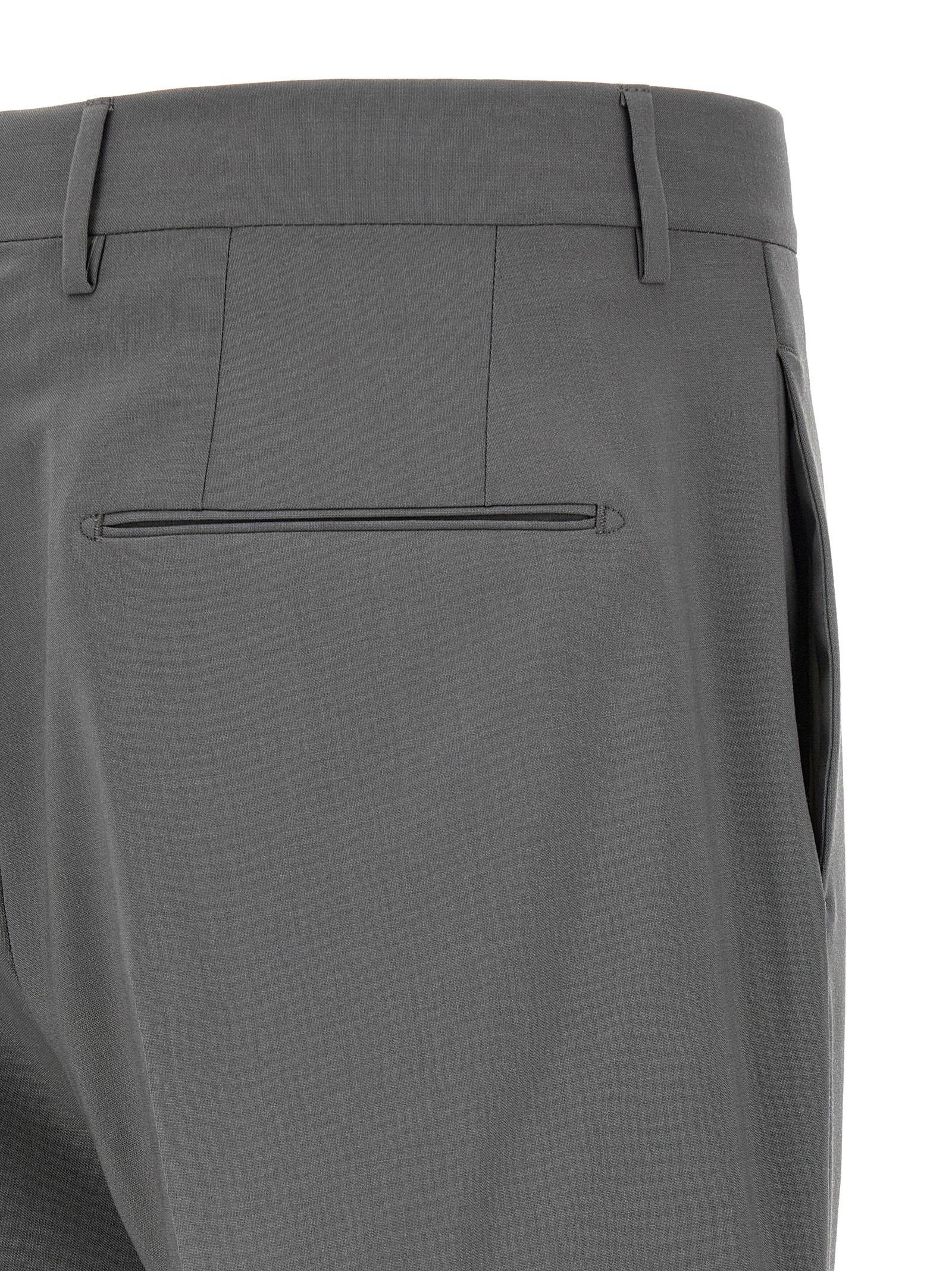 ‘New York’ wool dress consisting of double-breasted blazer with front horn button closure, peak lapels with removable metal brooch, chest pocket, flap pockets, cupro half-lining, two inner pockets, cuffs with open buttonholes, back slit and trousers with stretched pleat, straight leg, front French pockets, back welt pockets, zip hook and front button closure, Cotton lining.