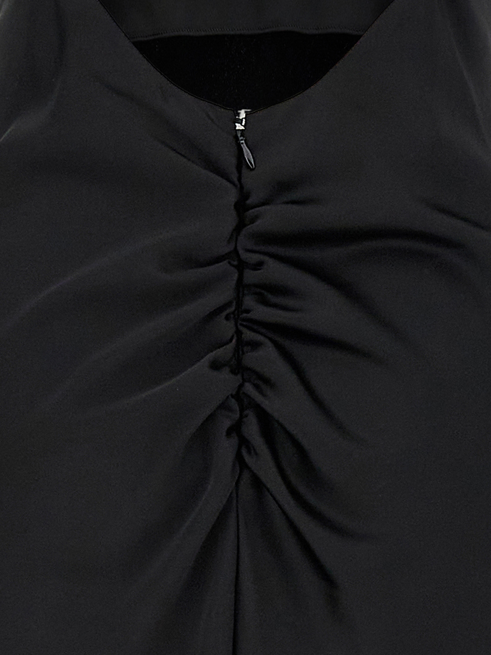 Long satin Ninfa dress, with round neckline, sleeveless with thin straps, bare back with curl and back zip closure, mermaid skirt.