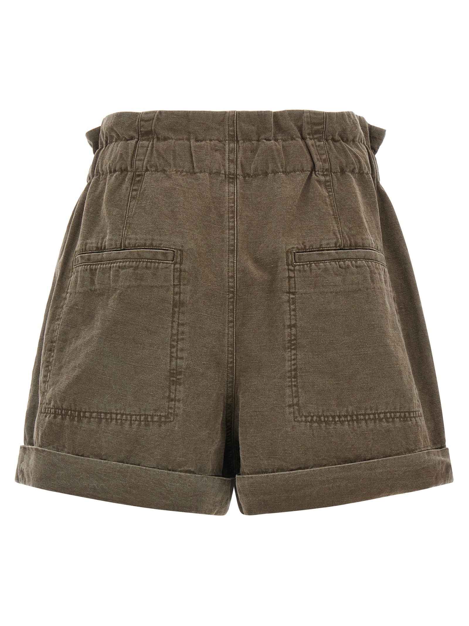 ‘Nirma’ cotton canas, crinkled at the waist with elastic and front knotted drawstring, zip and snap closure, pin tucks at the waist, wide leg with turn-up at the bottom, oblique side pockets.