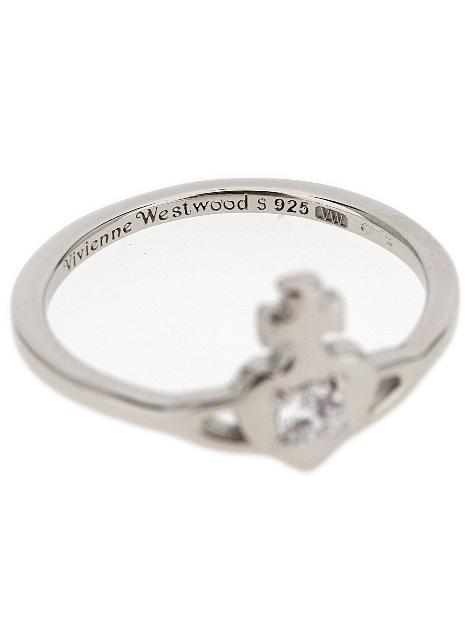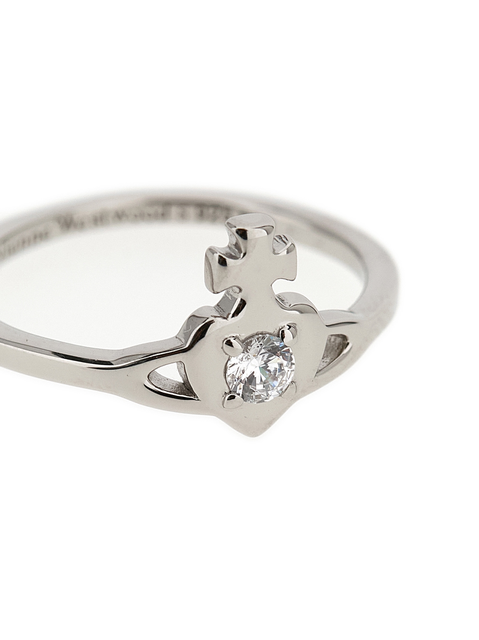 ‘Noella’ silver ring, Orb cut-out heart logo with crystal in the center, inner engraving.