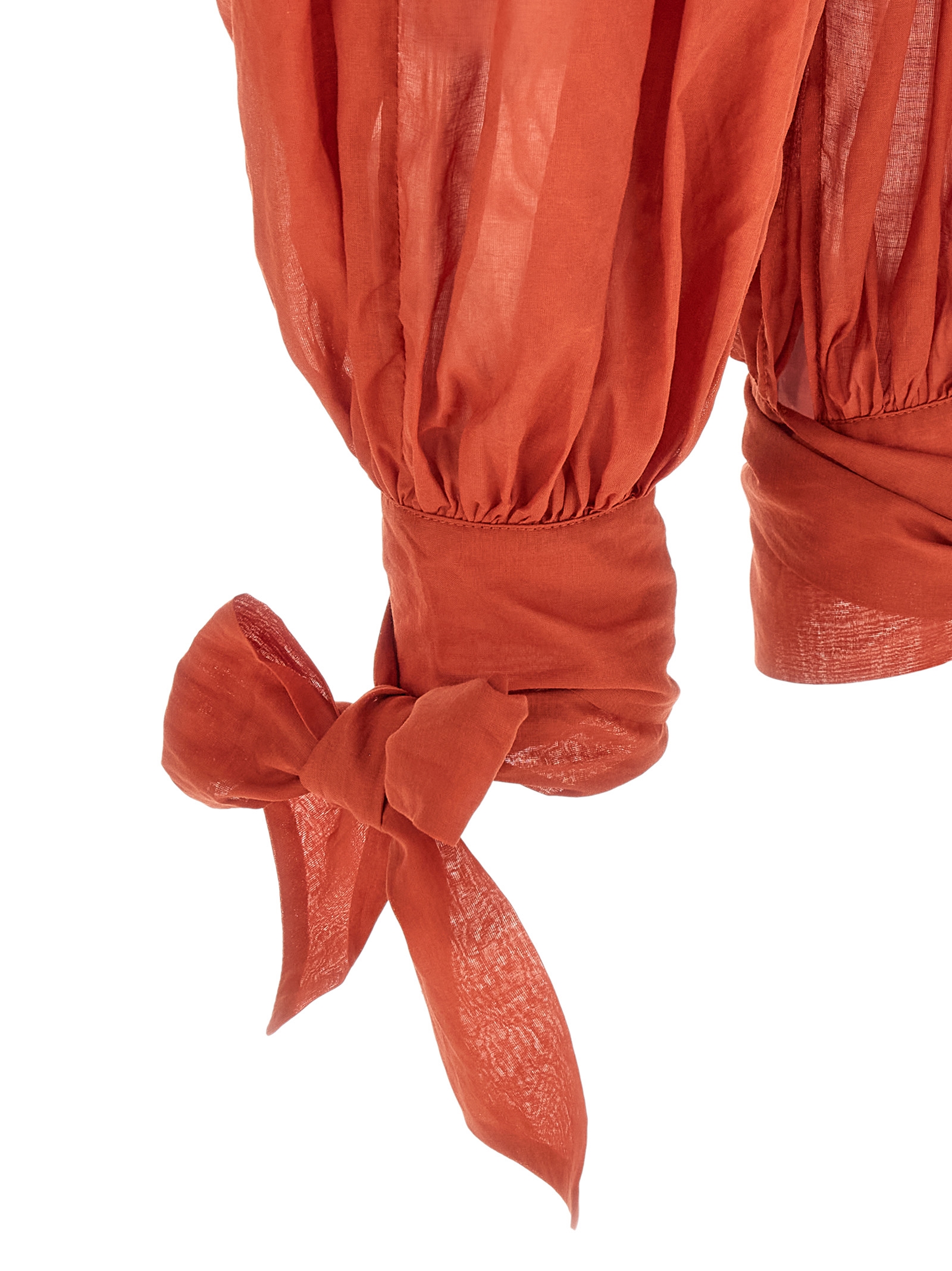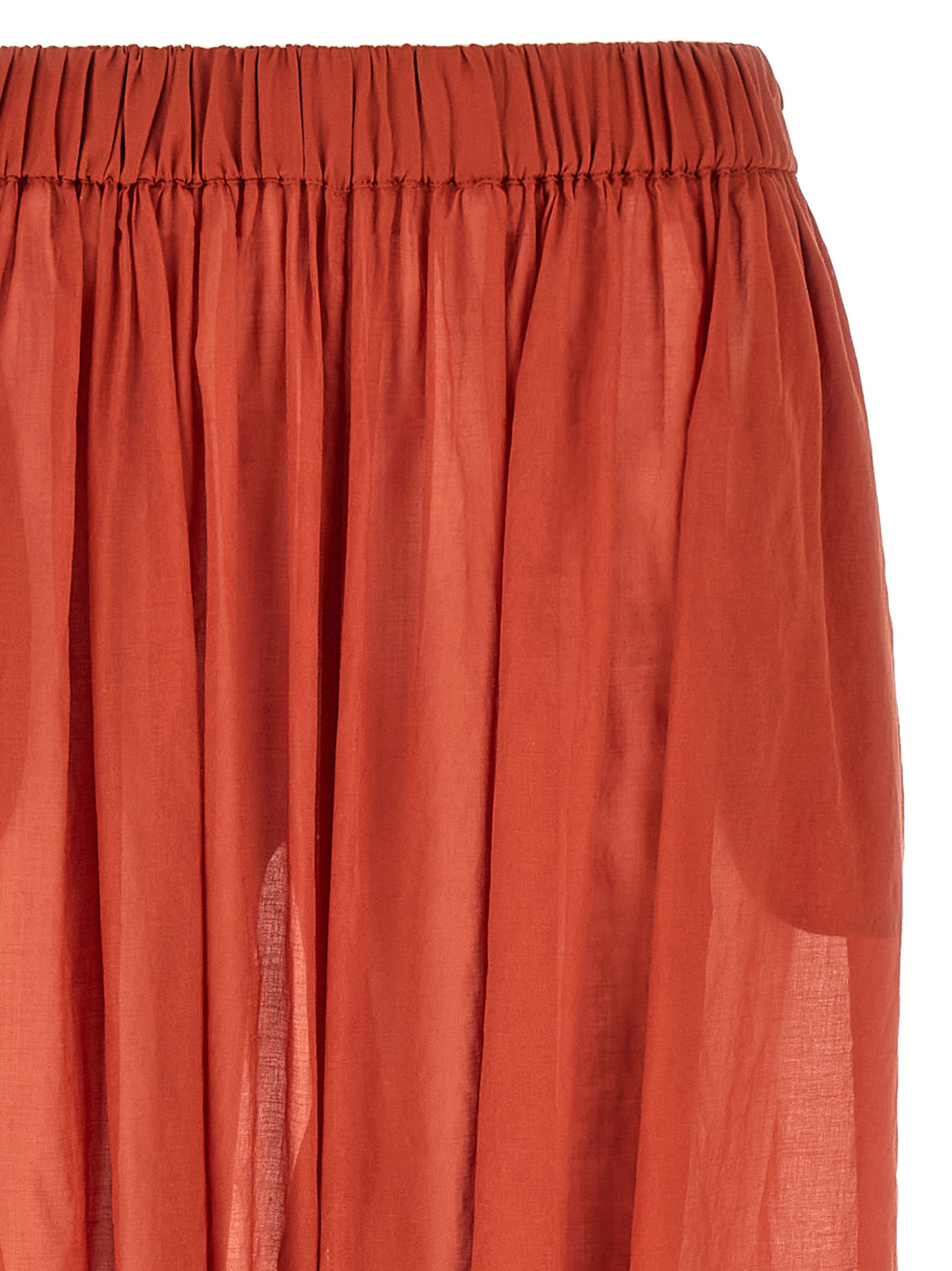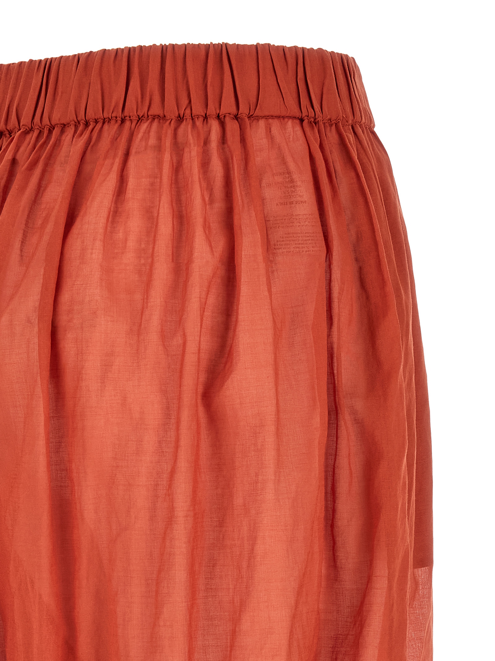 ‘Noor’ trousers in light cotton muslin, wide leg, elastic waistband, pockets, cuffs on the leg bottom with tape to tie as desired.