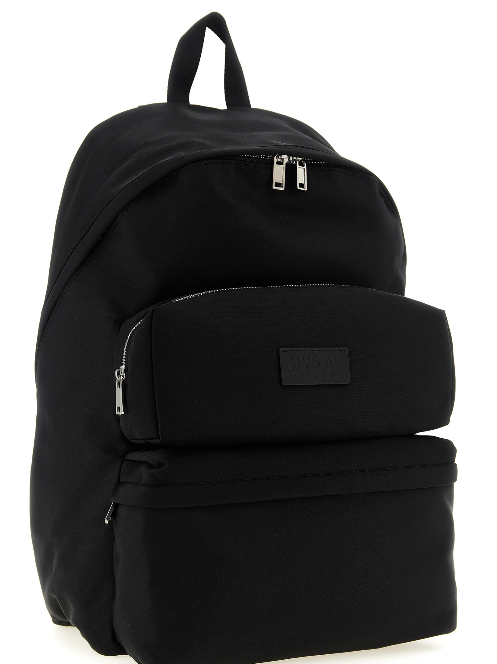 ‘Numeric’ nylon mat backpack, multi-pocket style, leather patch with embossed ‘Numeric Signature MM6’ on the front, fixed handle, top zip closure, adjustable shoulder straps, padded backrest, and ‘White Stitch Line’ at the back.