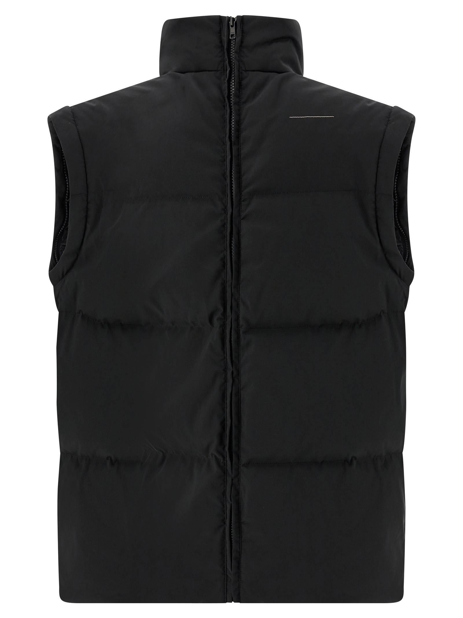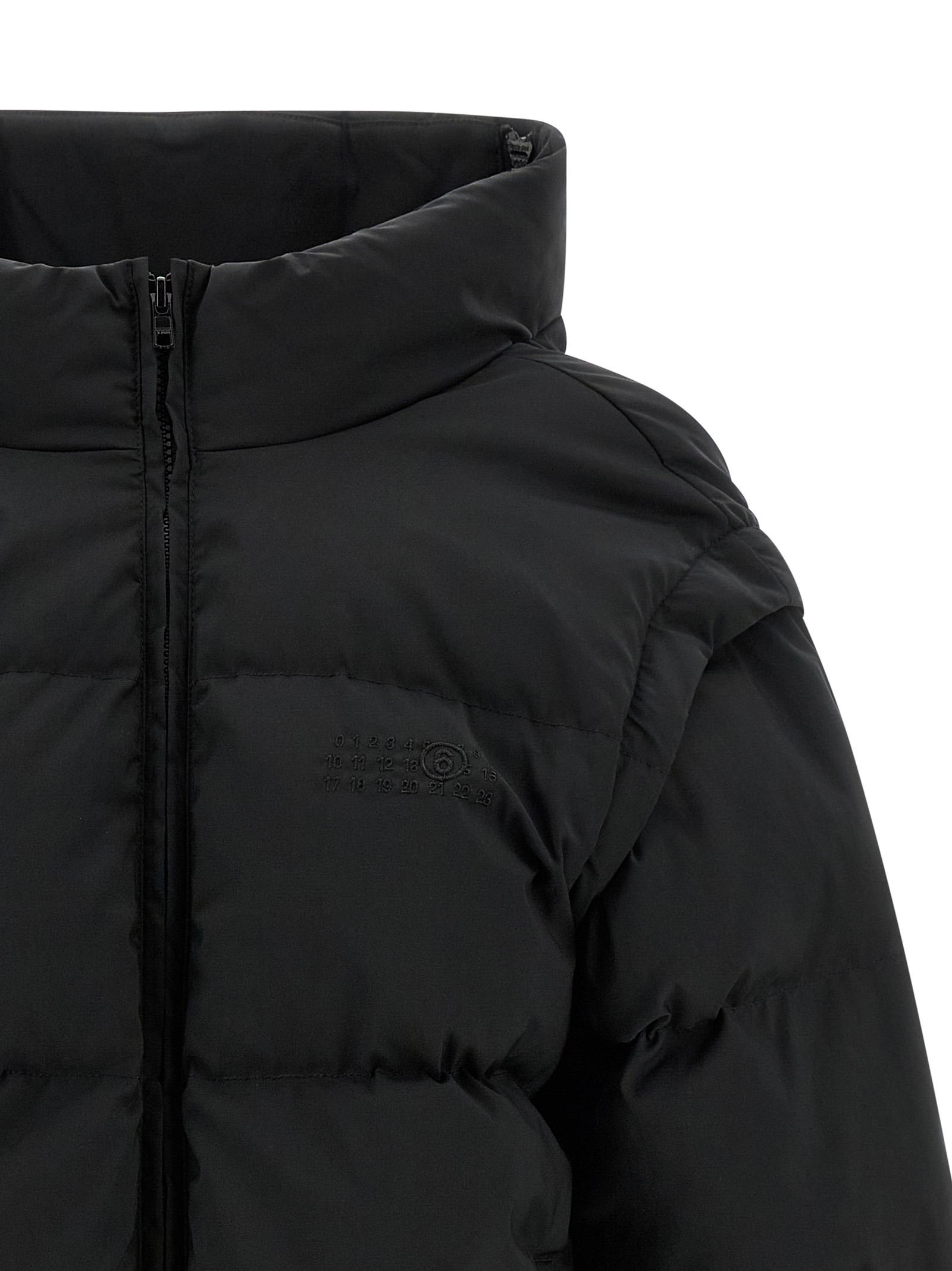 Quilted and goose feather padded fabric down jacket, tone-on-tone ‘Numeric signature MM6’ embroidery and front zip closure, funnel-shaped high neck, pockets, removable long sleeves with elastic, drawstring at the hem, back panel expandable with zip.