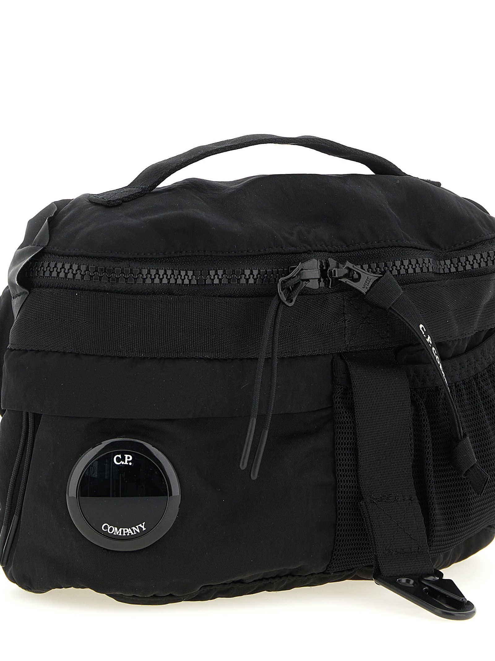 Garment-dyed Nylon B fanny pack with anti-drip treatment, multi-pocket style, zip closure, top handle, iconic C.P. Company ‘Lente’ and front snap hook, adjustable shoulder strap with tuc closure.