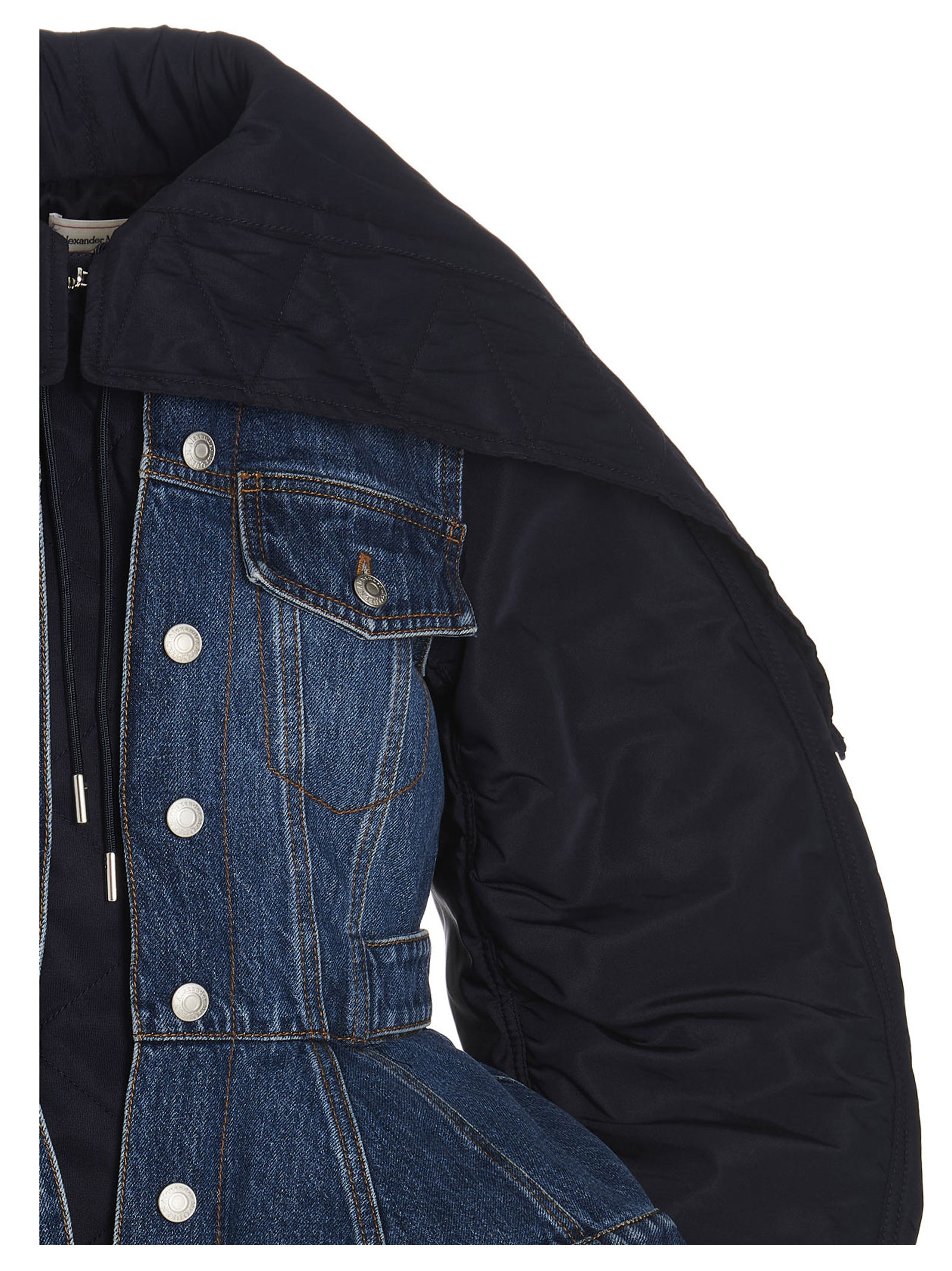 Denim jacket with nylon down jacket inserts, a zip and button closure, long sleeves, denim plastron, an asymmetric hemline with a drawstring at the bottom and a split at the back.