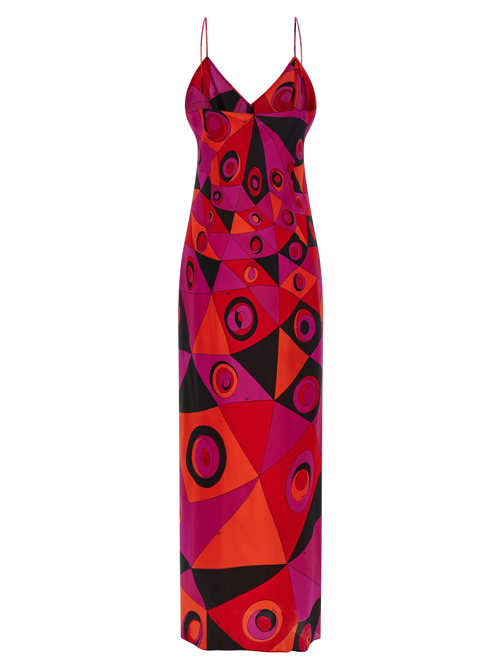 Long dress in ‘Occhi’ print silk crêpe de chine with deep V-neck on the front, thin straps, sleeveless, side split at the hem.