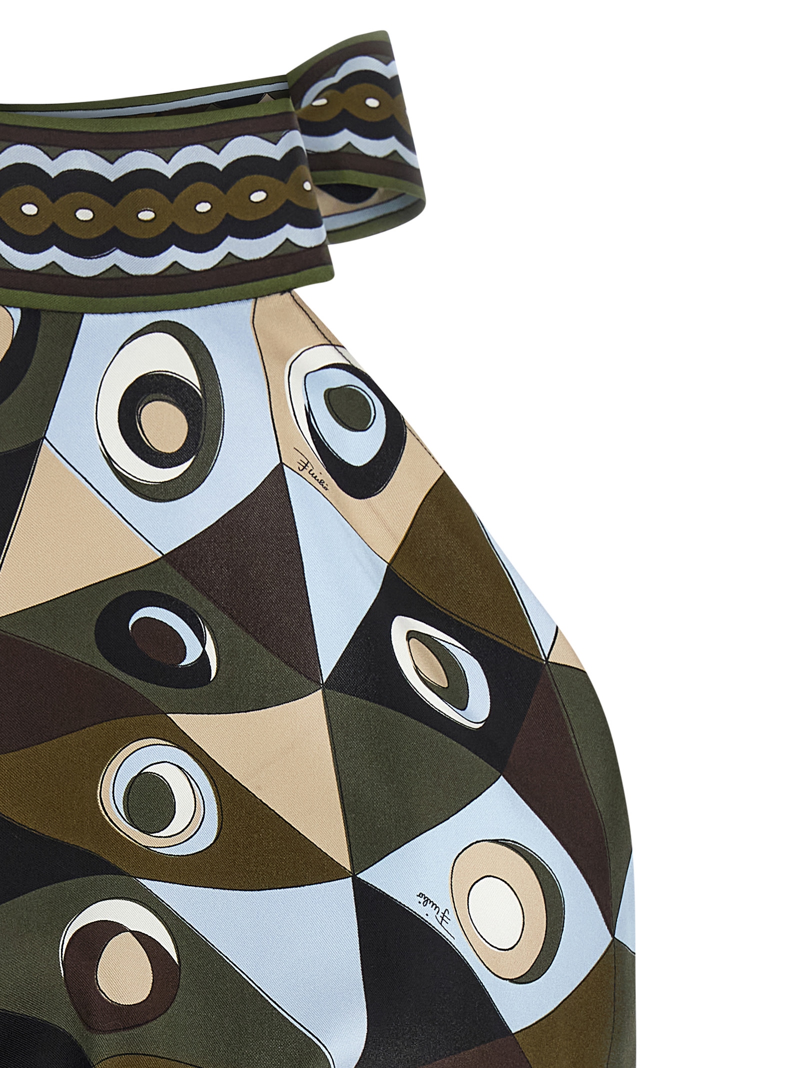 All-over ‘Occhi’ print silk twill top, high neck with sash to tie at the back, bare back.