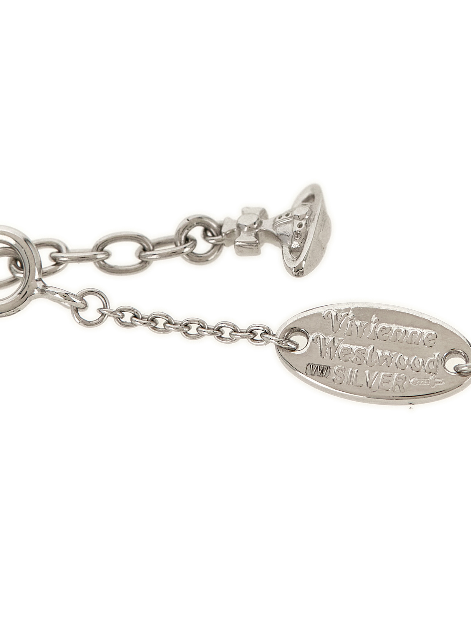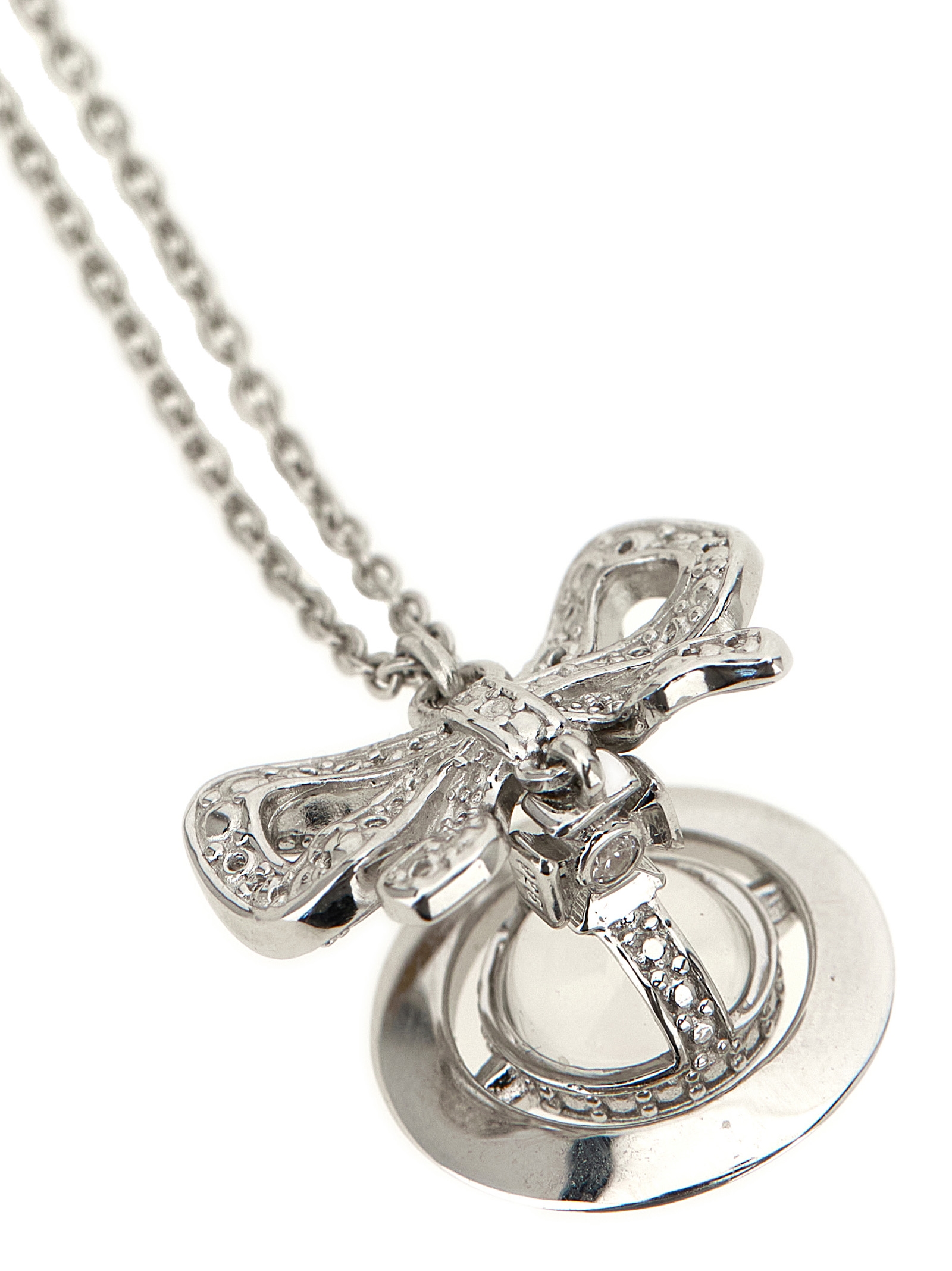 Octavie Pendant’ chain necklace in silver with platinum finish, adjustable length, bow with crystals and Orb logo charm.