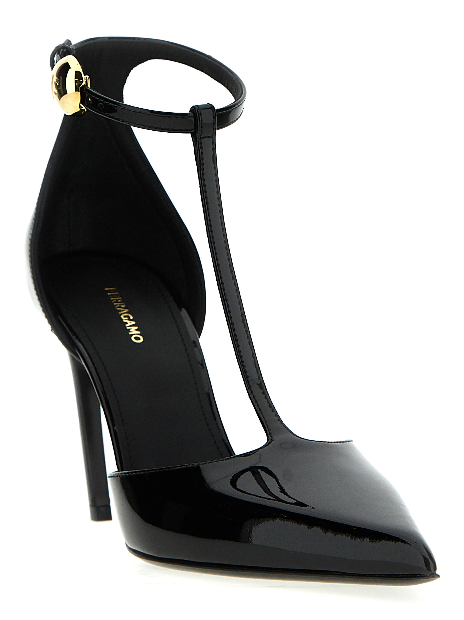 ‘Odette’ patent leather pumps with ankle strap, contoured and curved heel.