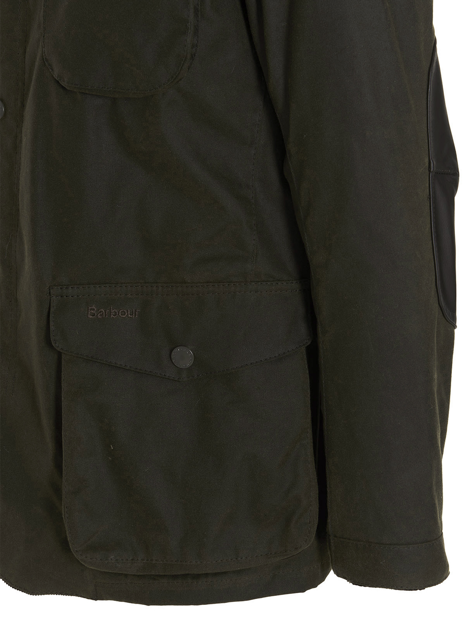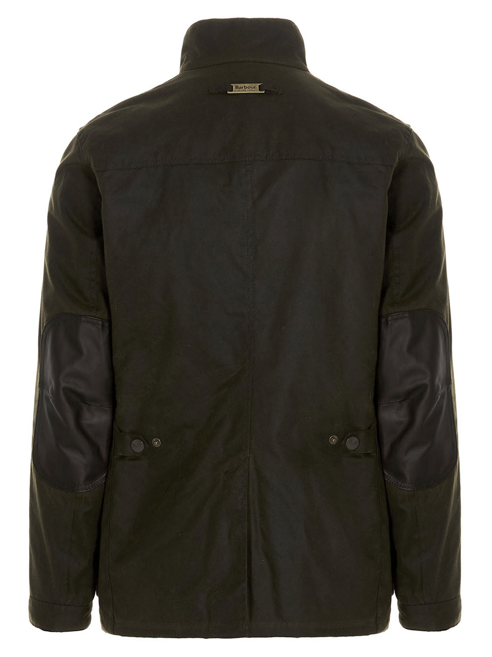 Waxed cotton ‘Ogston’ jacket, check fabric lining, front snap button closure with quilted fabric insert, high collar and zipper closure, pockets, long sleeve with leather elbow patch, back vent.