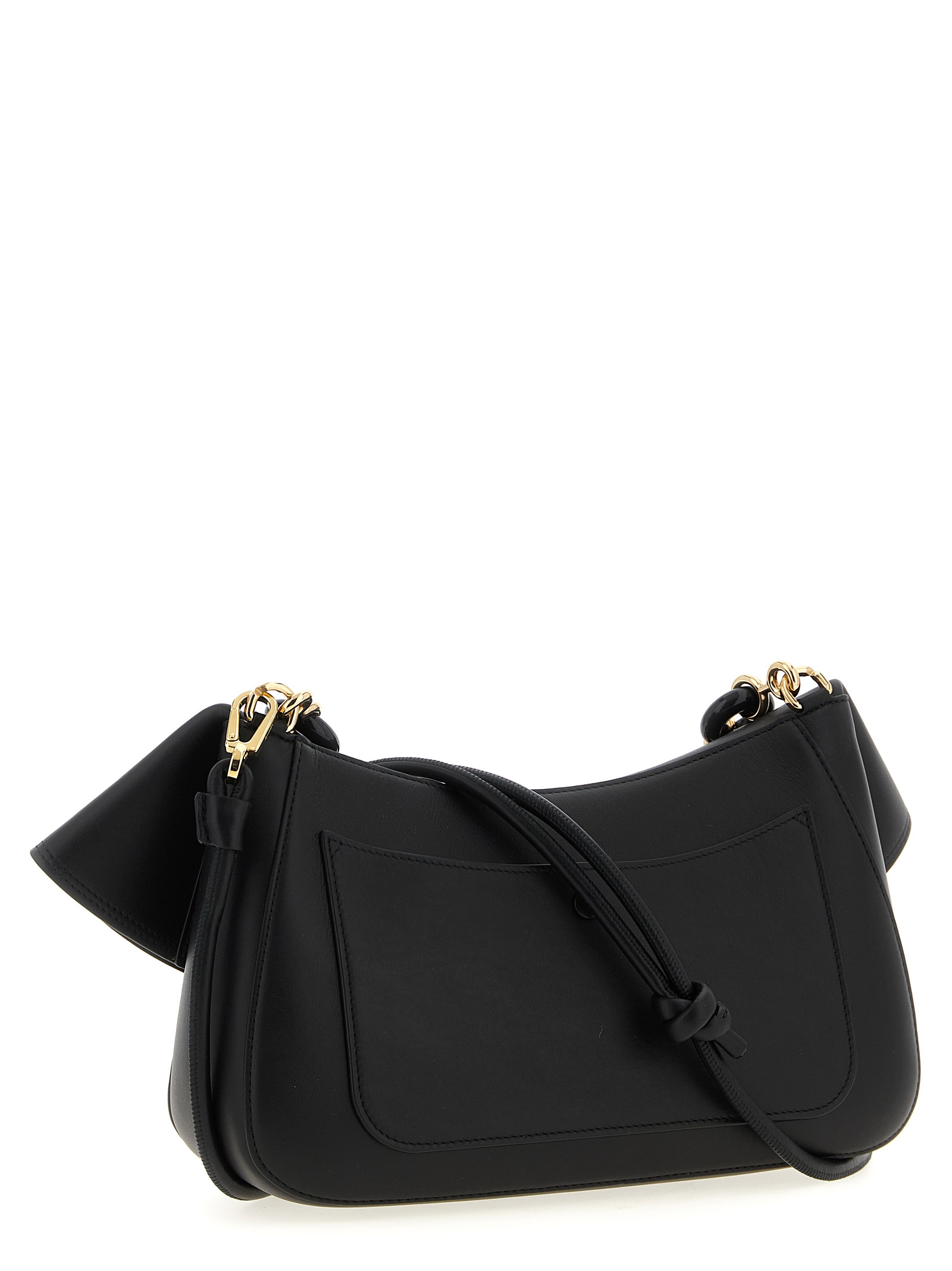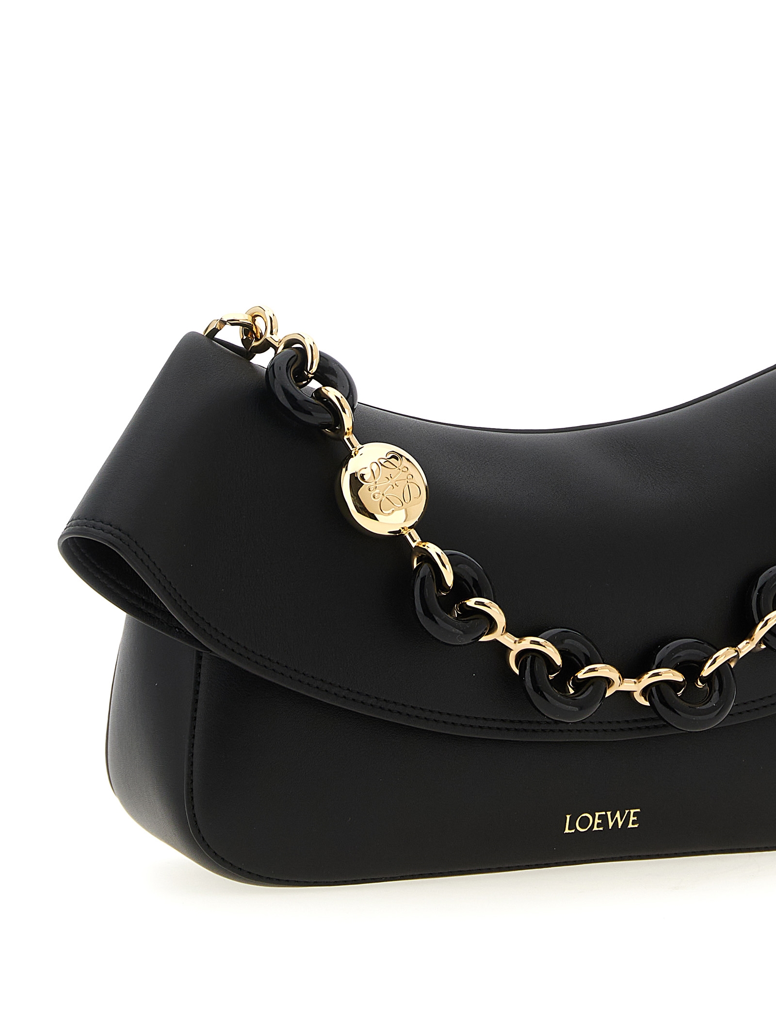 ‘Ola’ shoulder bag in smooth calf leather with front embossed logo, folded flap closure, removable donut chain handle, adjustable and removable shoulder strap.