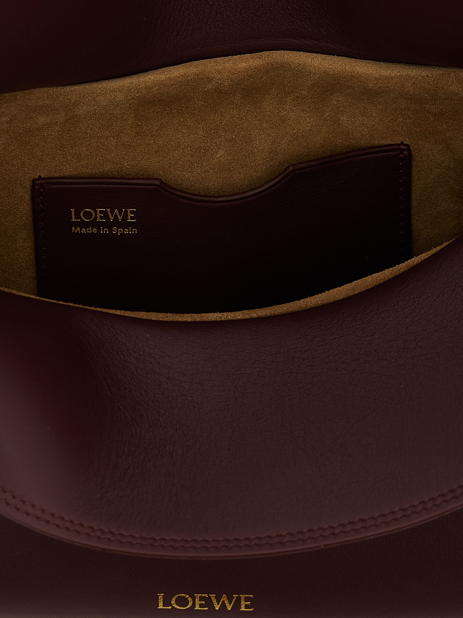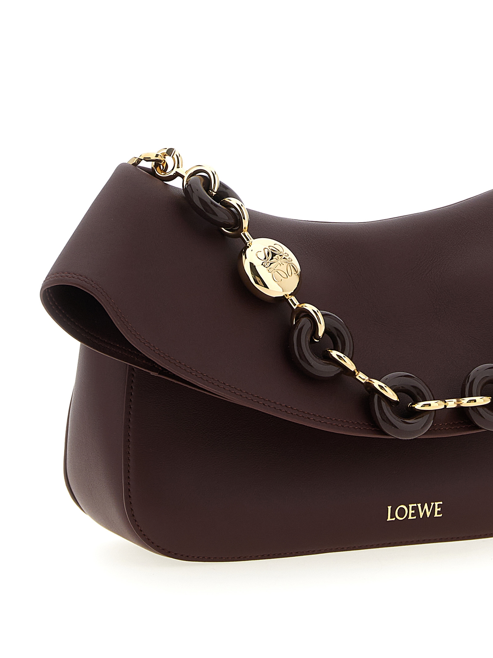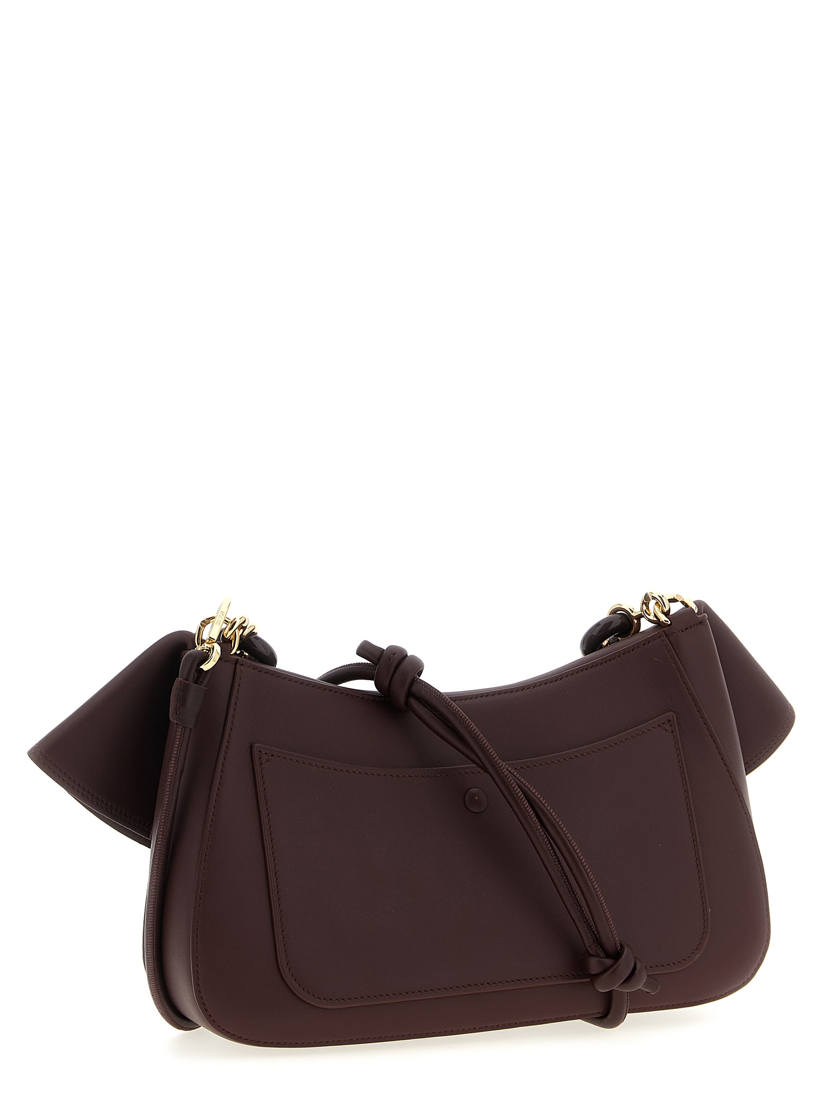 ‘Ola’ shoulder bag in smooth calf leather with front embossed logo, folded flap closure, removable donut chain handle, adjustable and removable shoulder strap.