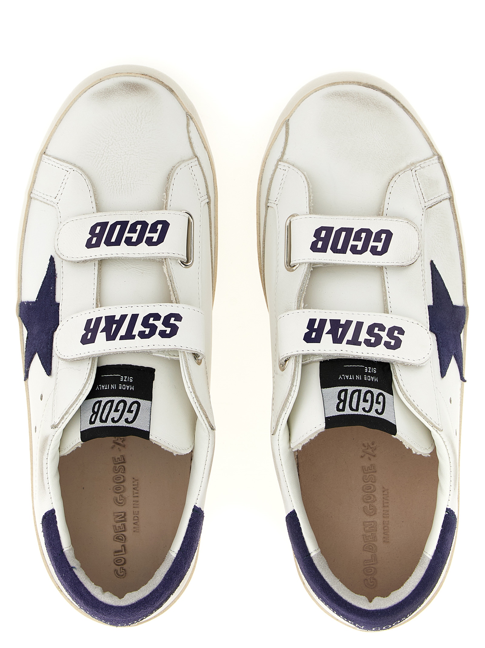 ‘Old School’ used-effect leather sneakers with contrast side star and suede heel, Velcro band closure and logo print, rubber sole with vintage effect treatment.