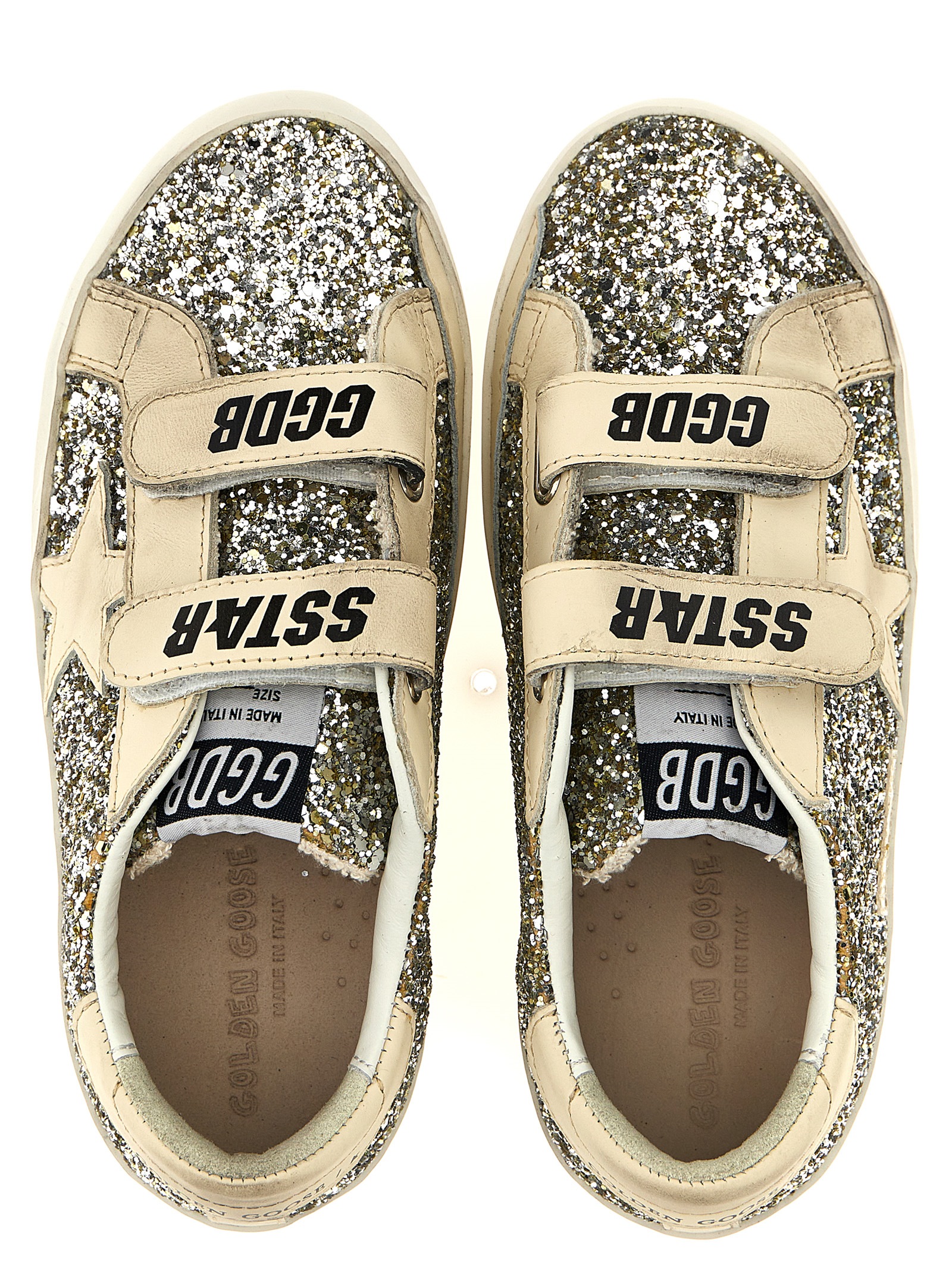 ‘Old School’ leather and glitter sneakers with contrast side star and heel, Velcro band closure and logo print, rubber sole.