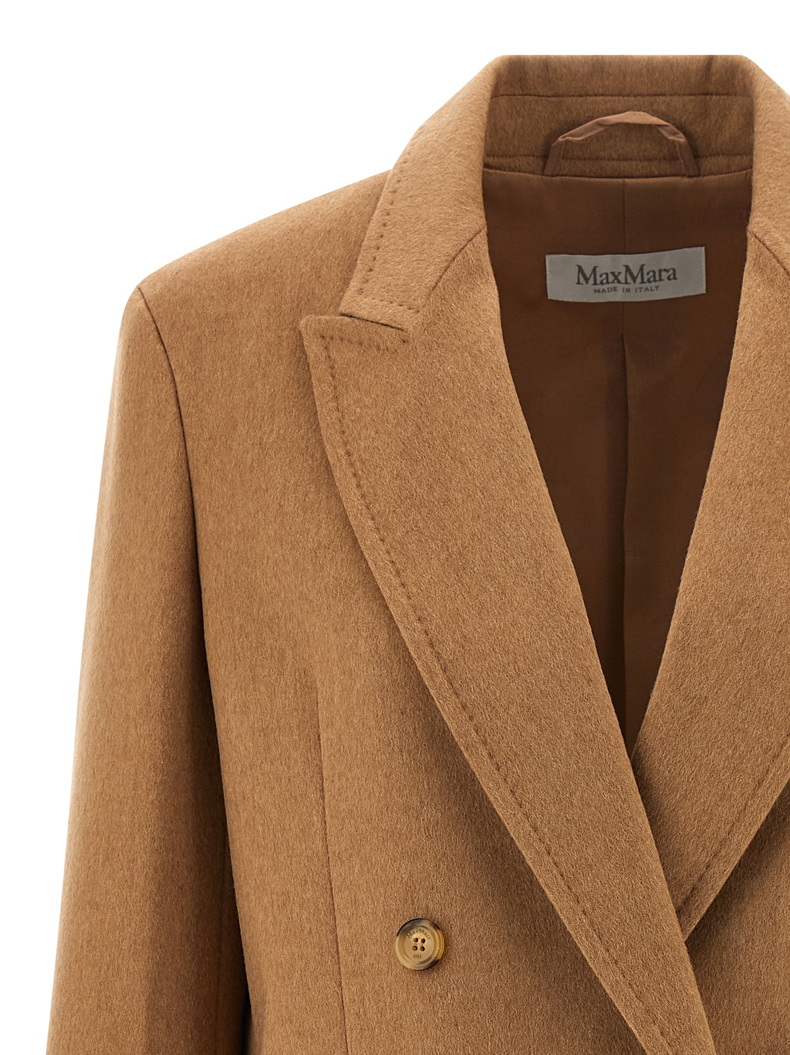 ‘Olimpia’ double-breasted blazer in light sable baby camel drap with sartorial dot with front button closure, peak lapels, breast pocket, flap pockets, long sleeves, structured shoulder strap, back slits, lining.