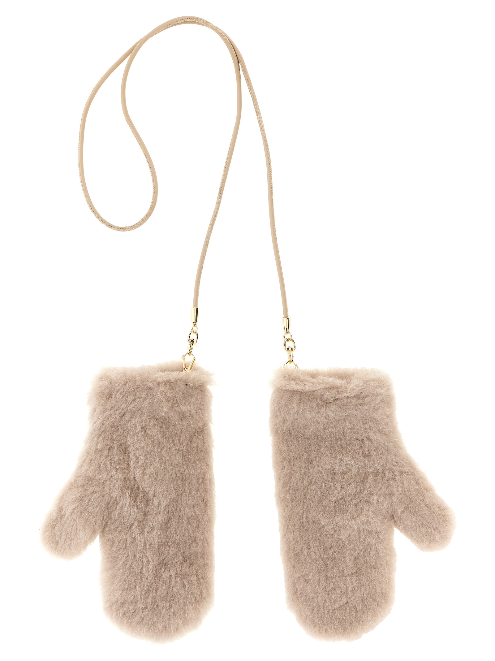 Ombrato mittens in alpaca and wool Teddy fabric on a silk base, pure wool yarn lining, removable cord with metal snap hook.
