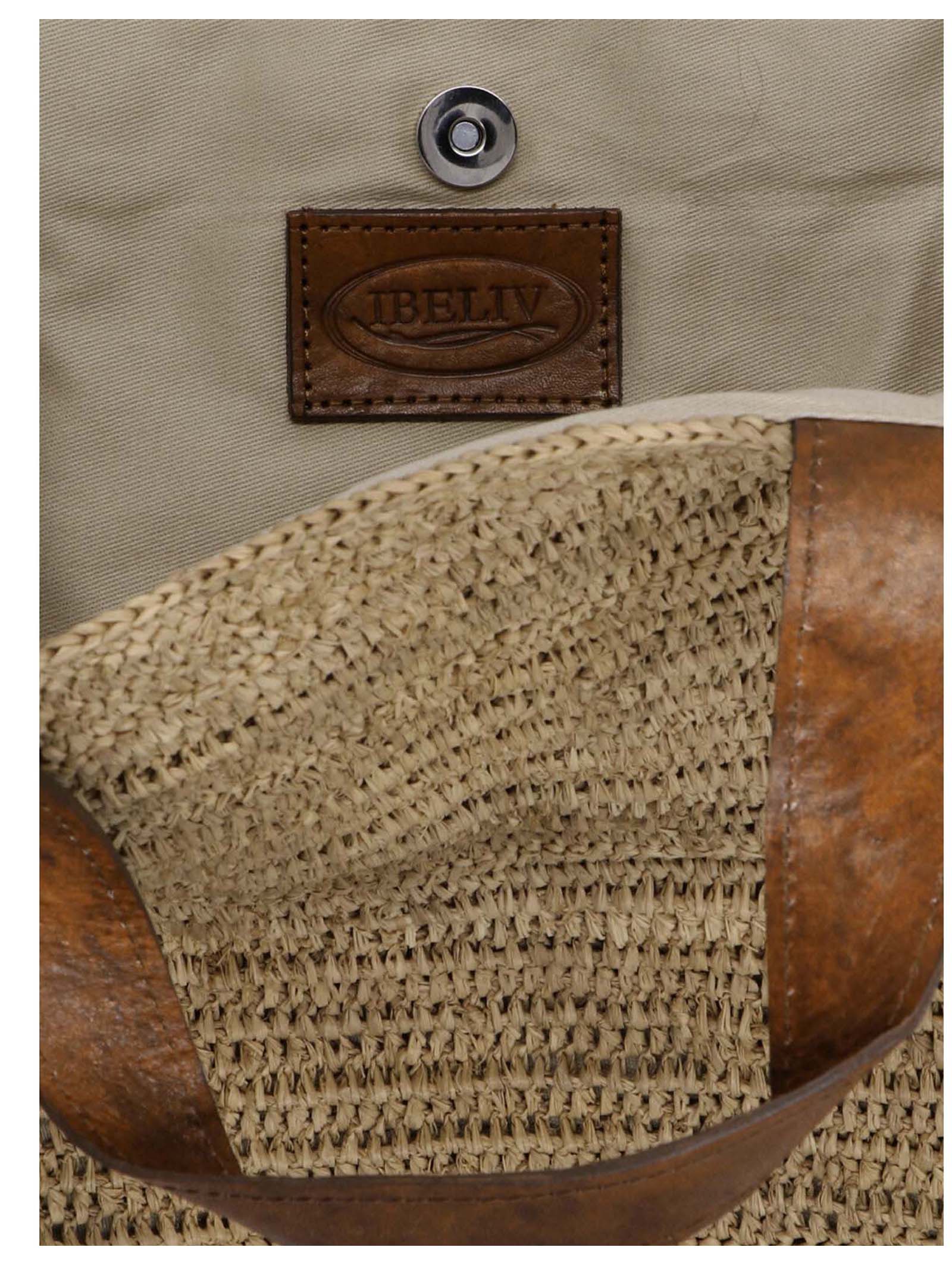 ‘Onja’ raffia handbag with leather handles, and fringes on the side.