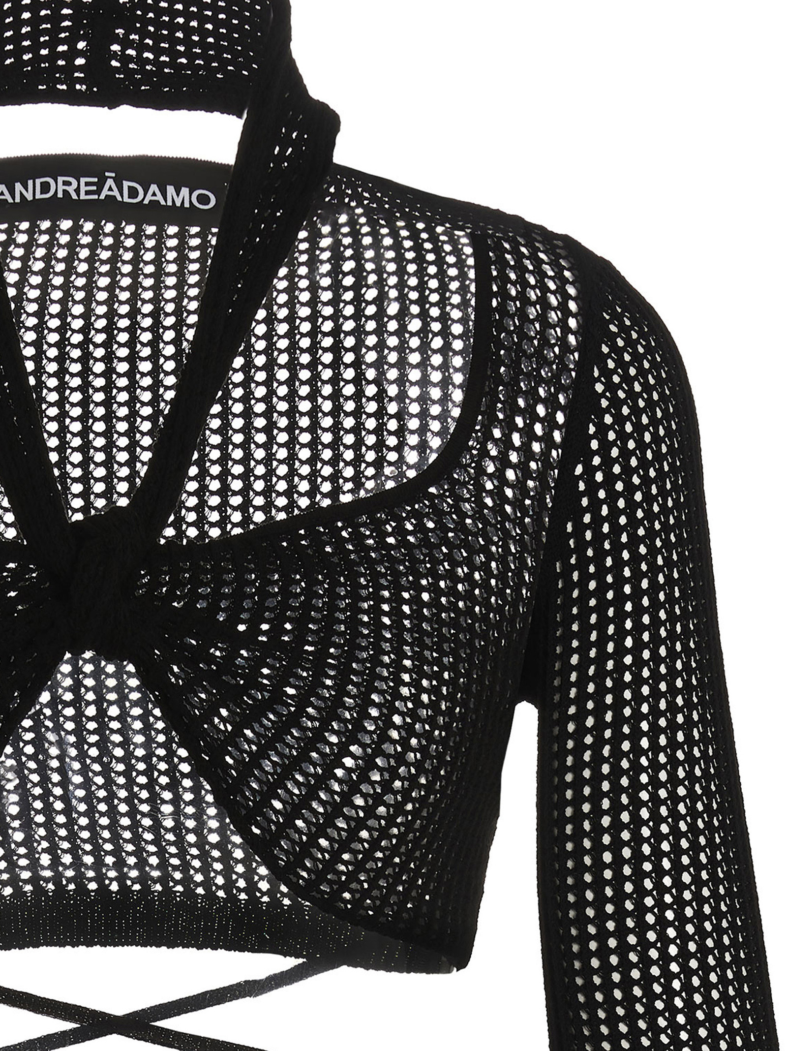 Openwork knit cropped top with front knot detailing, long sleeves and lacing to tie at the waist.