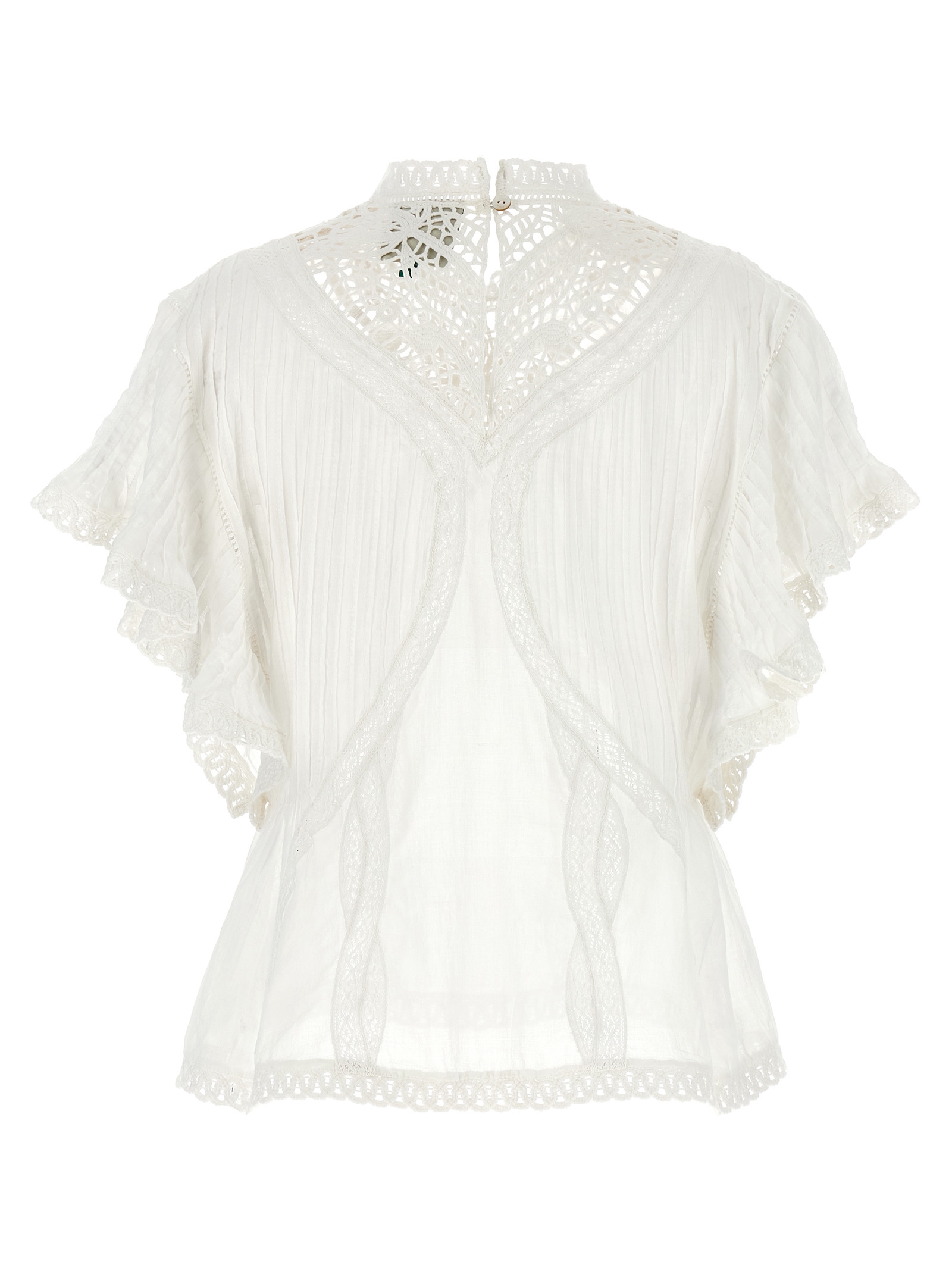 Cotton blouse with perforated details, pleats and pleats on the front and back, piping with crocheted embroidered tone-on-tone trimmings, hourglass silhouette, high neck with back button closure and cut-out teardrop detail, and short sleeves with ruffles.