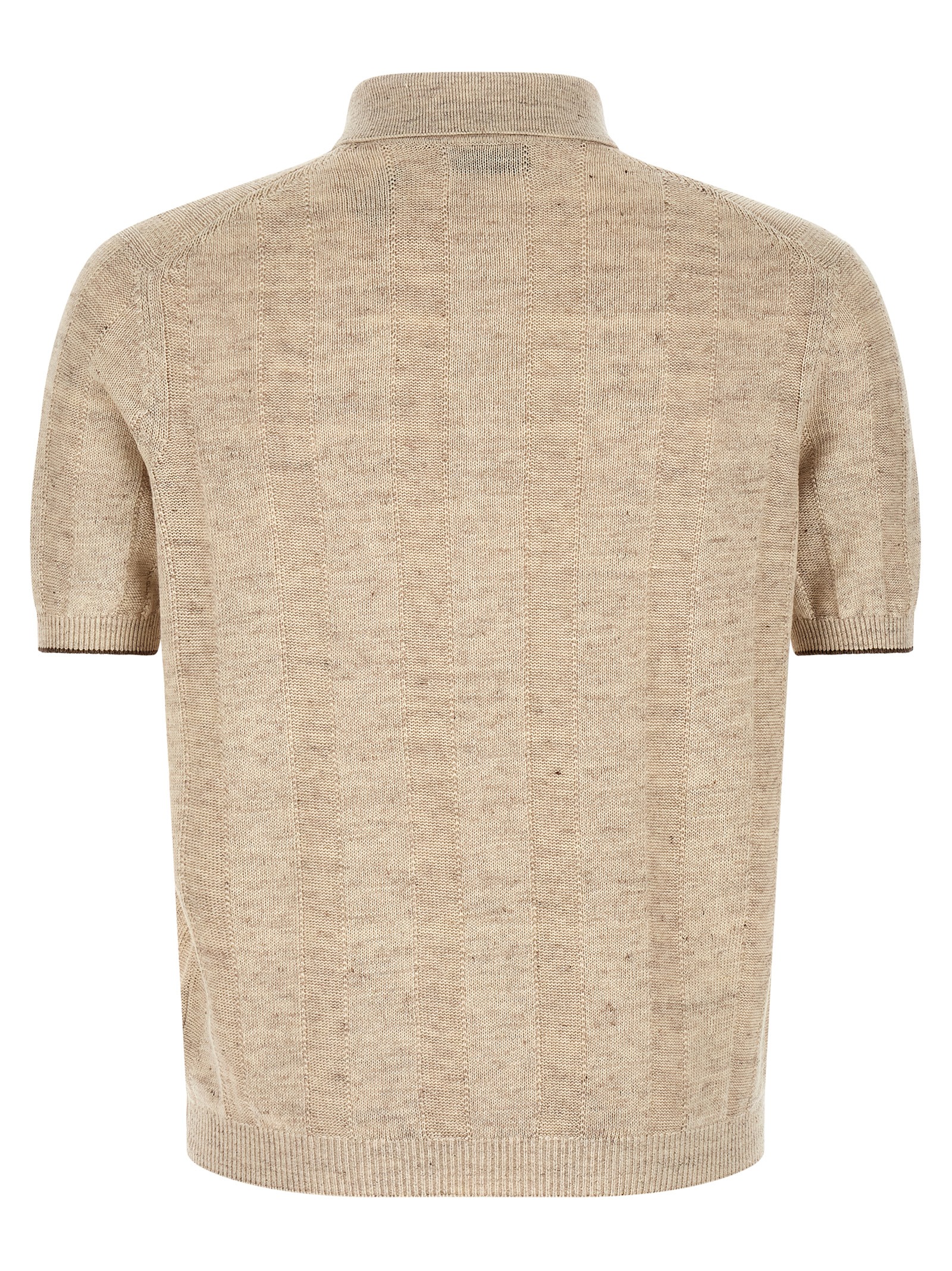 Ribbed knit shirt in linen and cotton with mother-of-pearl button closure on the front, short sleeves with cuffs with contrasting detail, and band on the bottom of the garment.