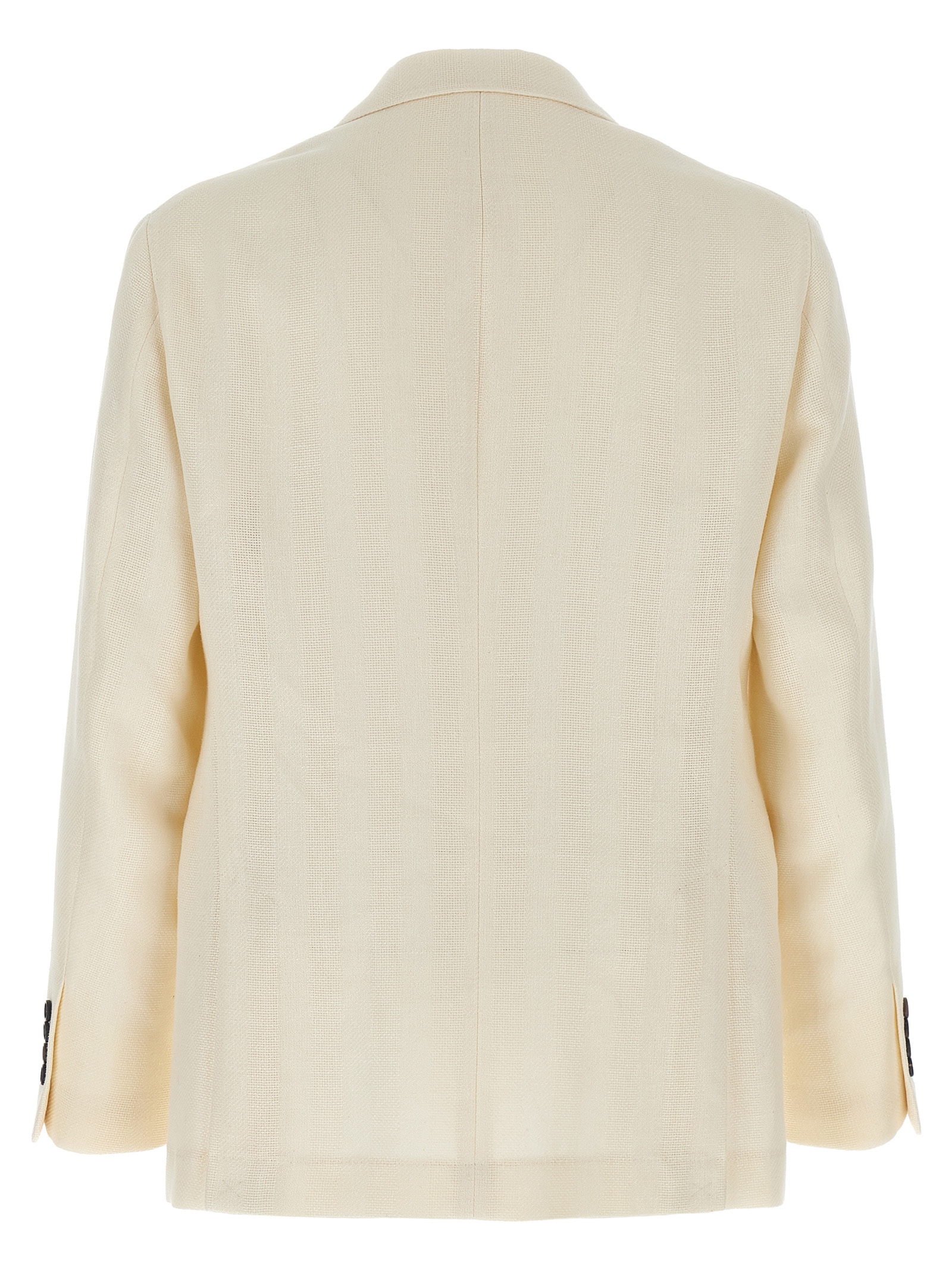 Blazer in linen, silk, wool and cotton blend with diagonal weave, flamed texture and motif with operated line, deconstructed single-breasted model with front button closure, mirror lapels, breast pocket, flap pockets, half cupro lining, two inner pockets with button closure and pen pocket, Solomeo shoulder, cuffs with