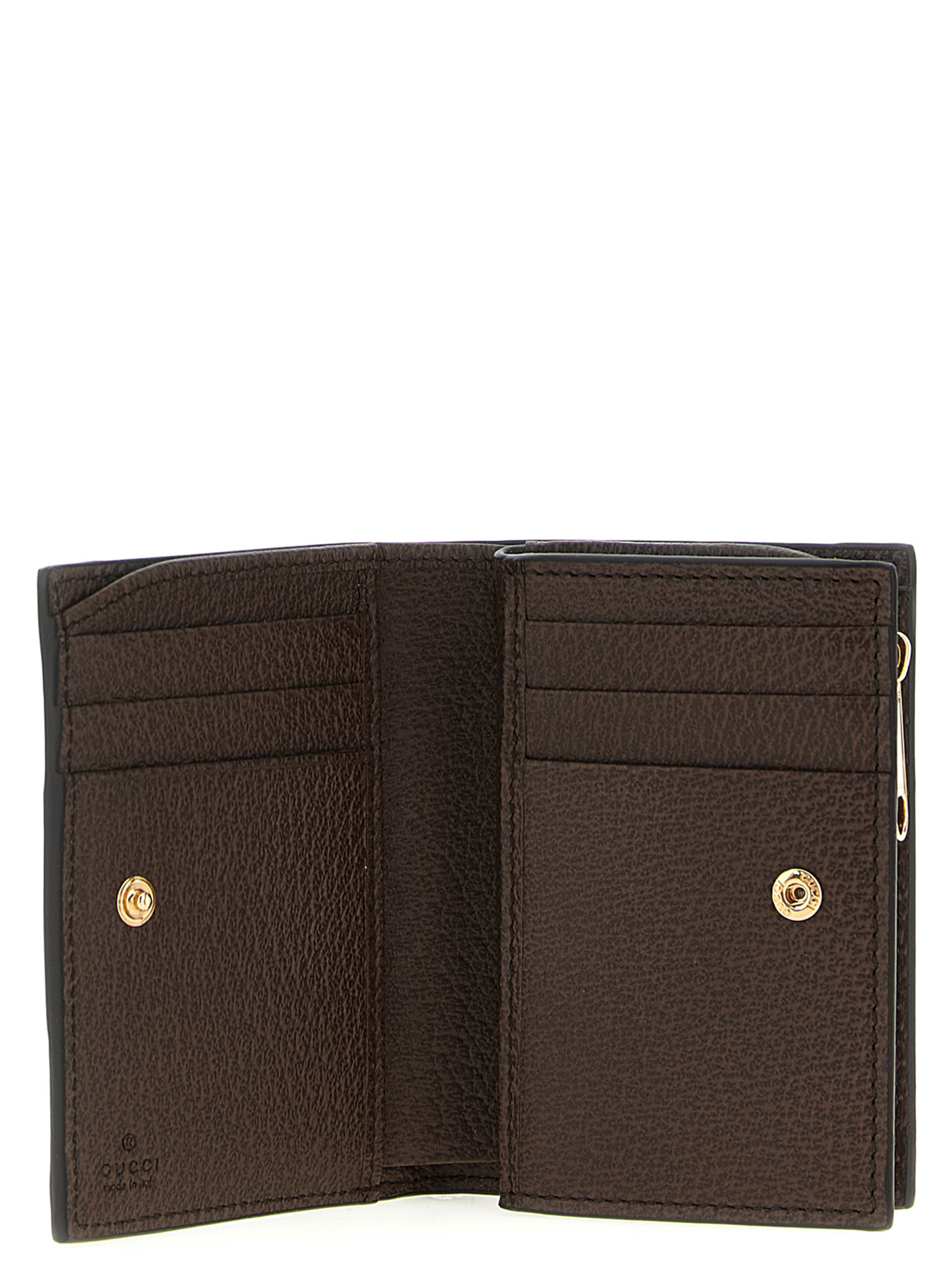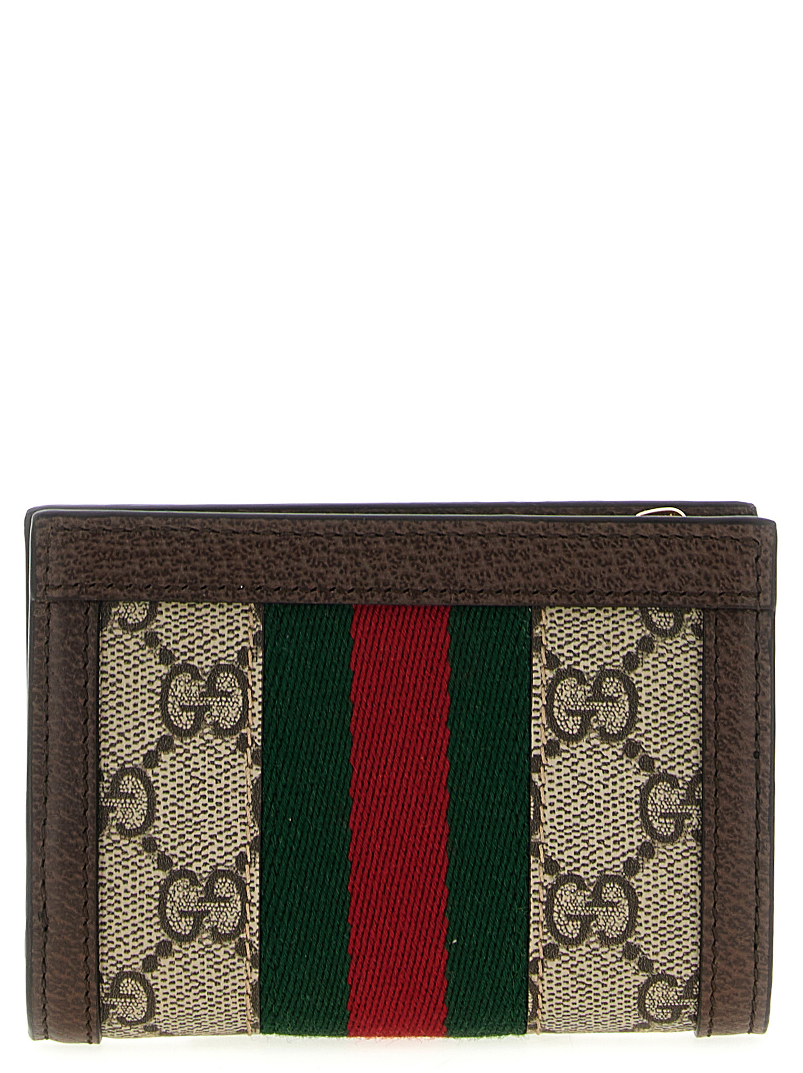 GG Supreme fabric Ophidia wallet with leather trim, green and red web pattern, gold trim, metal double G on the front, five card slots, bill compartment, zip pocket, snap button closure.