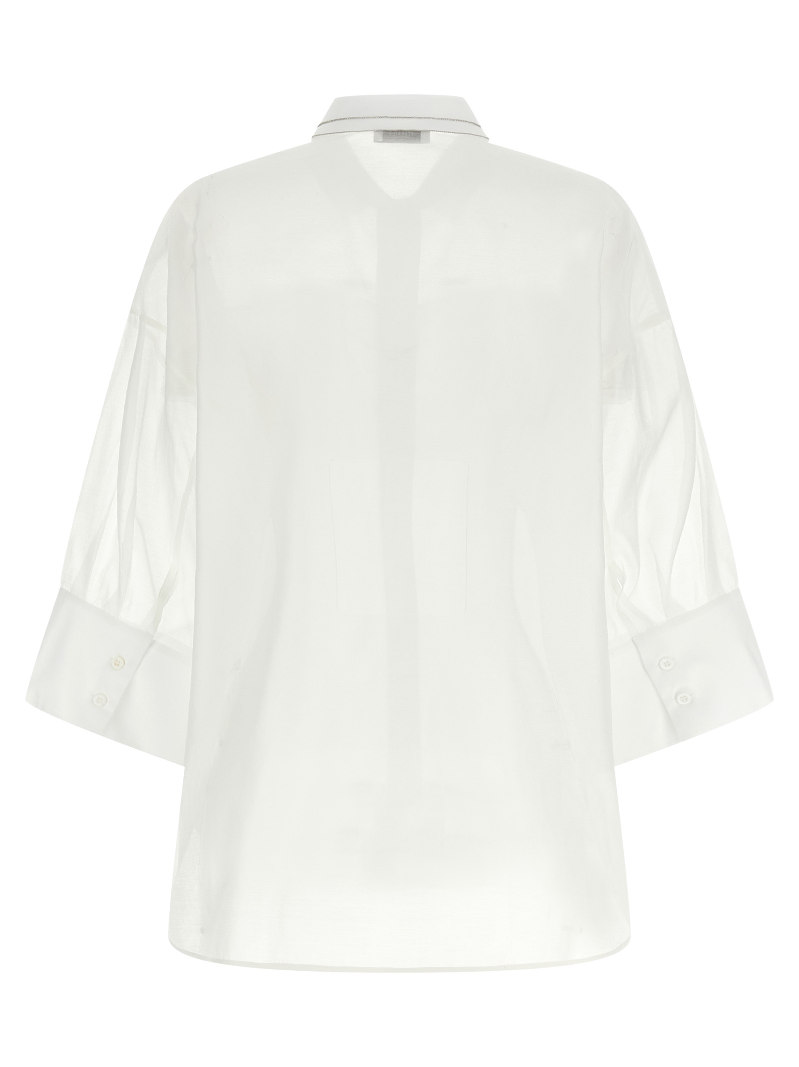 Stretch cotton poplin shirt with cotton and silk organza top insert, sail collar with metal ‘Punto Luce’, concealed front button closure, long wide sleeves with cuffs and dropped shoulder, side slits, rounded and asymmetrical hem.