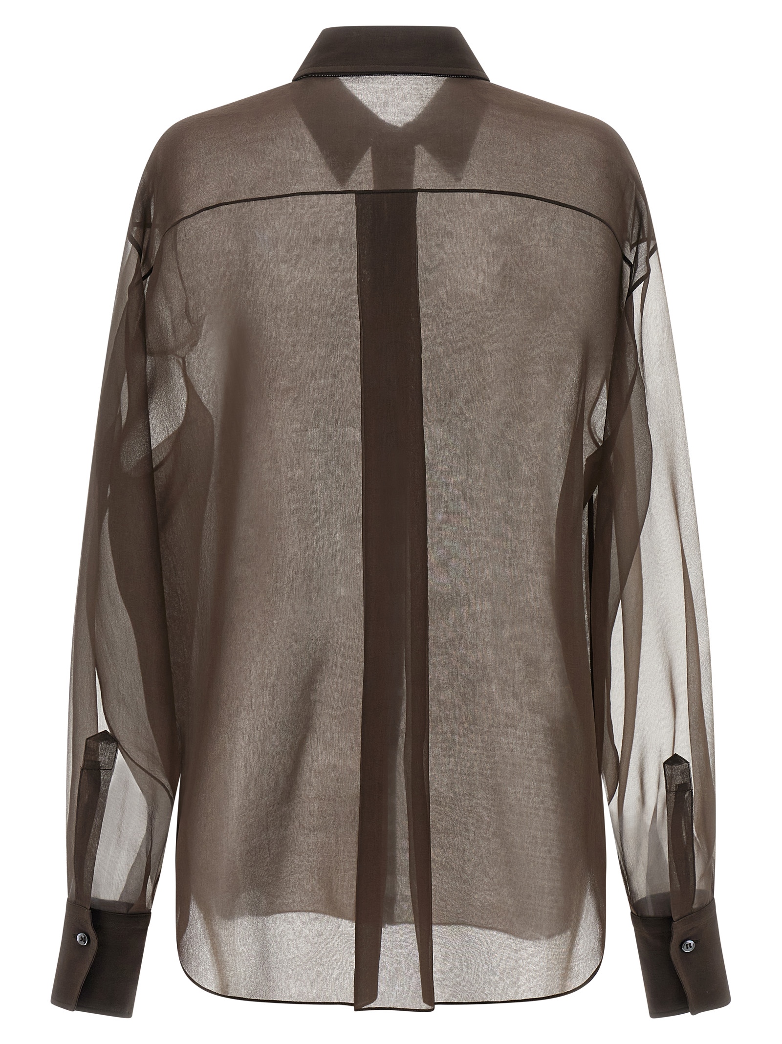 Transparent silk organza shirt with double layer, collar and front button closure, long sleeves with cuffs.