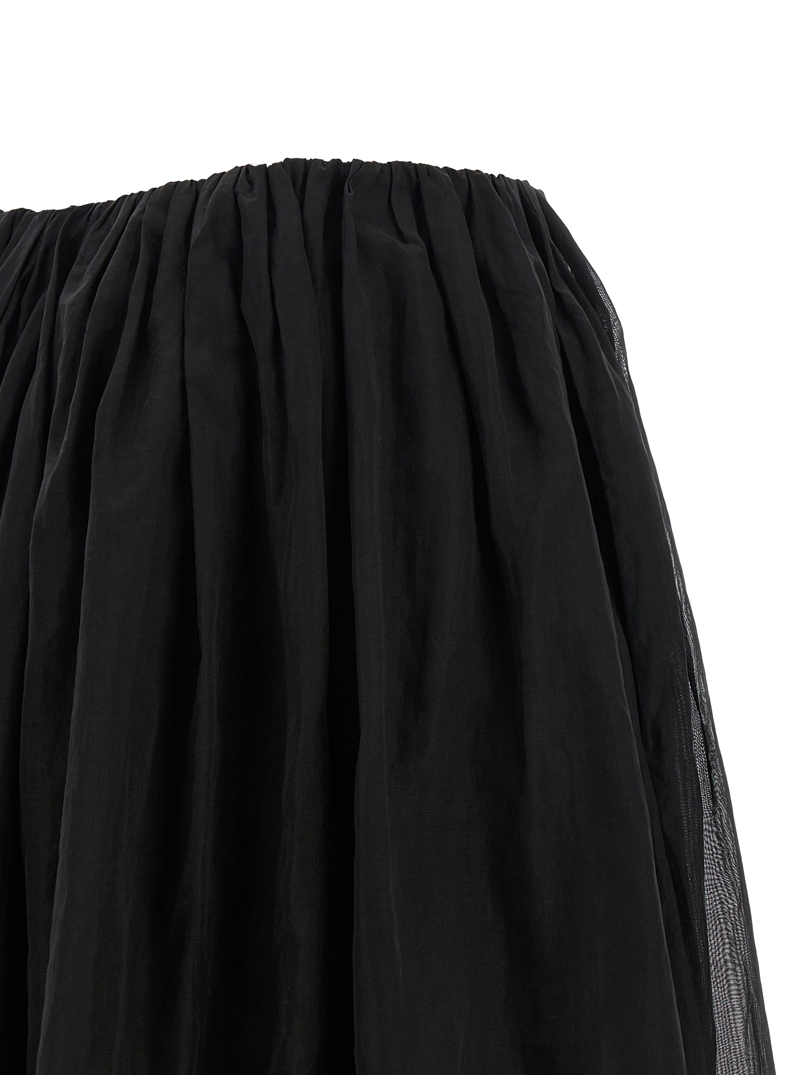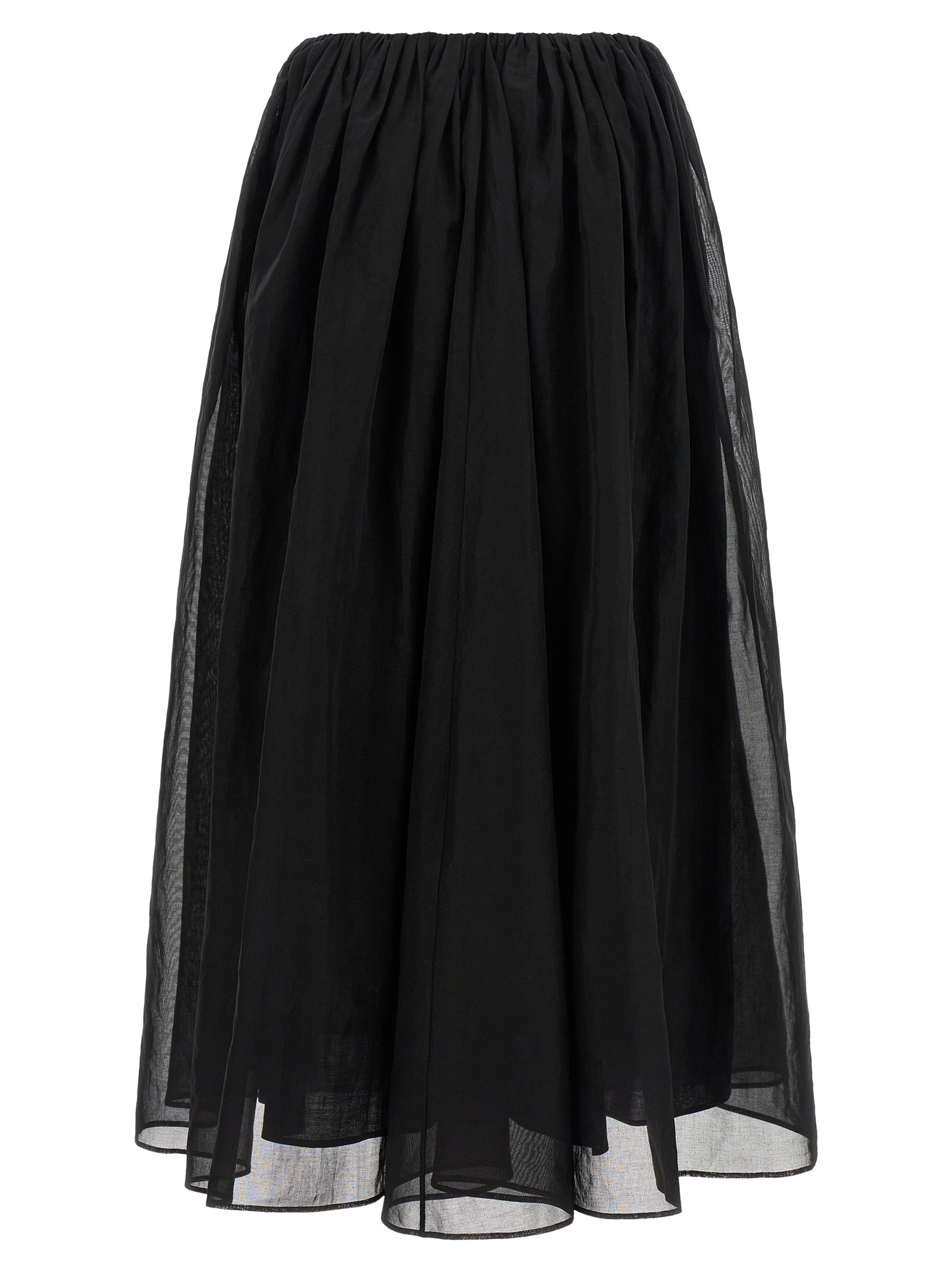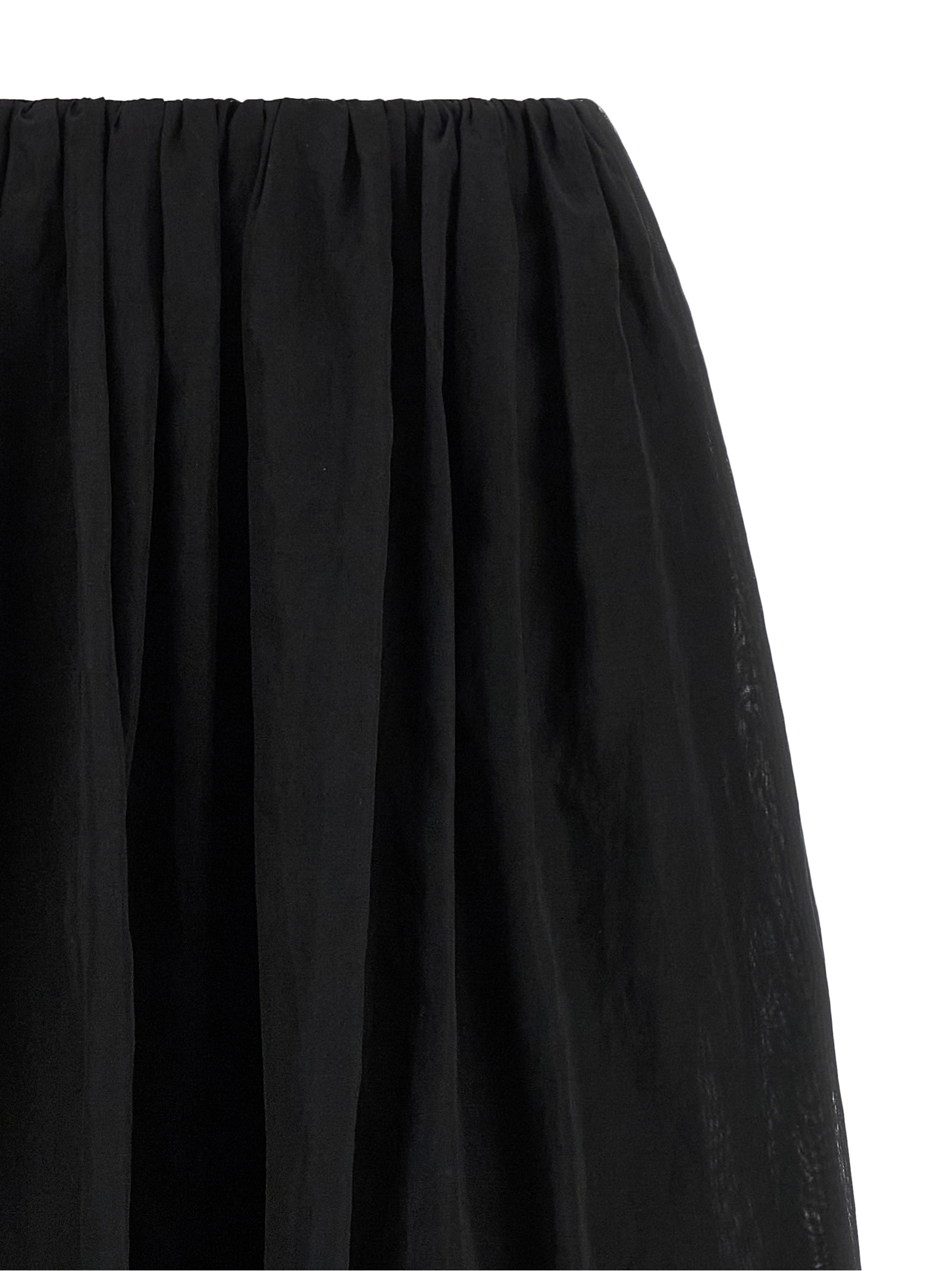 Long skirt in semi-transparent cotton organza with crunchy effect, flared silhouette, elastic waistband, pockets, cotton muslin underskirt.